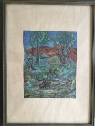 Jens Nielsen (1891-1978): Personer i landskab. Sign.: Jens Gouache på papir. Lille skjold på passepartout forneden - Maleriet perfekt. 25x20 (47x34) 22424