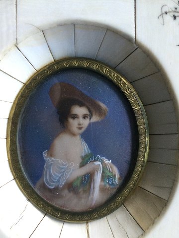 Ubekendt miniature maler (19 årh): Portræt af smuk ung kvinde med hat og frugtkurv. Gouache på ben. Indrammet i smuk benramme. Mål: 5x4 (10 x 8½)