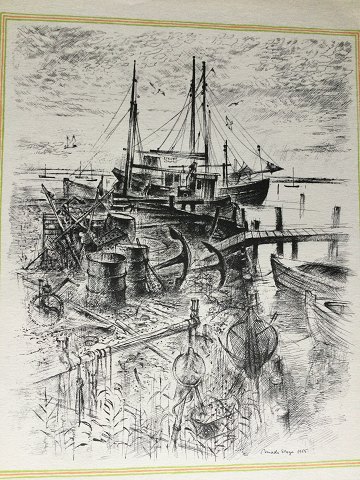 Mads Stage (1922-2004): Havneparti 1955 "Den Danske Statstelegraf" Tryk på papir. Sign.: Mads Stage i trykket Uden ramme 26x20½ 41821