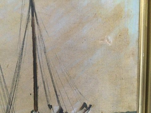 Gunner Bundgaard (1920-2005): Parti fra havnen i Hadsund. Olie på lærred. Defekt på lærred (se fotos) Sign.: G. Bundgaard 50x70 (62x82) 7225 Gunnar Bundgaard