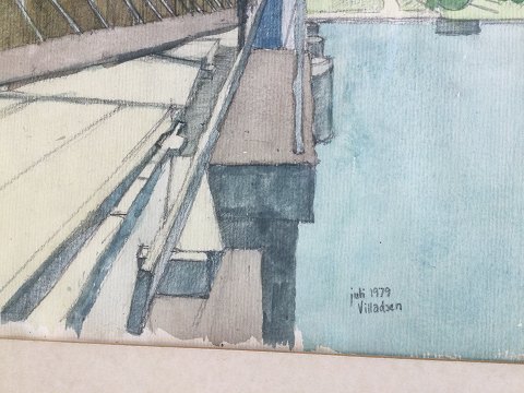 Ubekendt kunstner (20 årh): Komposition med bro 1979. Måske Jernbanebroen mellem Aalborg og Nørresundby? Akvarel på papir. Sign.: Villadsen Dateret Juli 1979 32x40 (48x55)