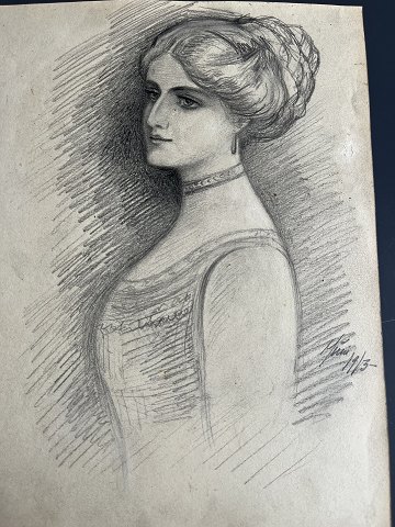 Bagpå tegning af smuk ung kvinde 1913 (bly/kul)