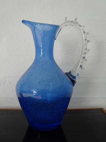 Søblå "boblet" kunstglaskande med klar takket hank. Antagelig Italien. Usigneret. Kuglet bund. Højde - 24 cm.