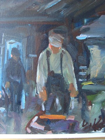 Uno Hubert Karlsson (født 1903): "Interiør fra smedje" Olie på lærred - nyrenset. Sign.: U. Karlsson 30x60 (47x77)