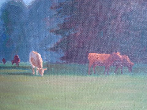 Oluf Søndergaard (1901-70): "Landskab med åløb og græssende dyr" Olie på lærred. Sign.: OSøndergaard. 72x96 (83x107) Søndergaard gik på teknisk skole i Aalborg og lærte tegning der.