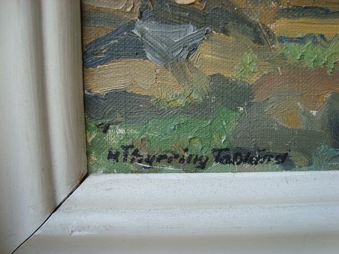 Ubekendt kunstner (20 årh): "Kystparti med by i baggrunden" Smukke lyse farver. Olie på lærred. Sign.: H. Thyrring T....... 27x34 (36x44)