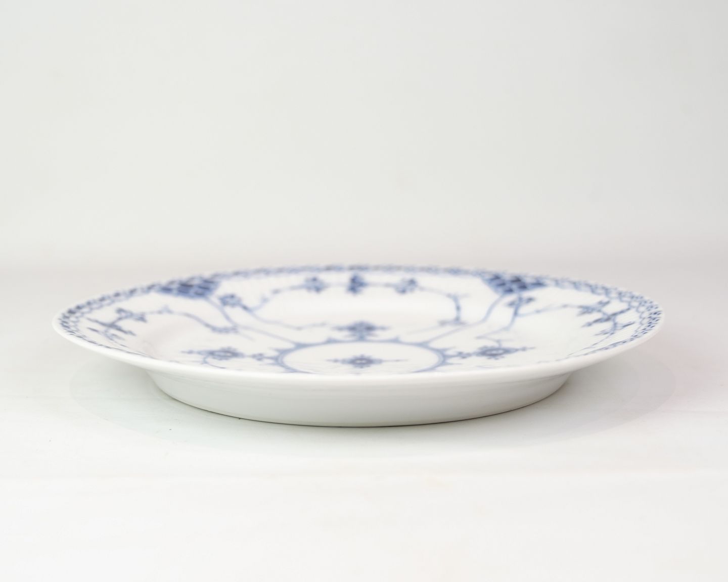 Dinner plate marked 1/577 from Royal Copenhagen. Made of porcelain with classic blue fluting half lace design. Hand painted in blue decoration.