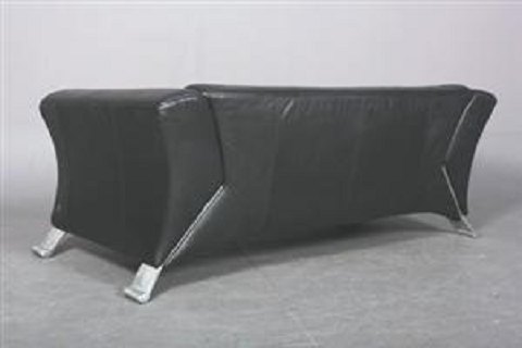 SoldRolf Benz. Three-seater sofa upholstered in black leather with 'Maori' pattern of bone aluminum. Produced by Benz furniture production model 322nd L. 205 cm. 5000 m2 showroom
