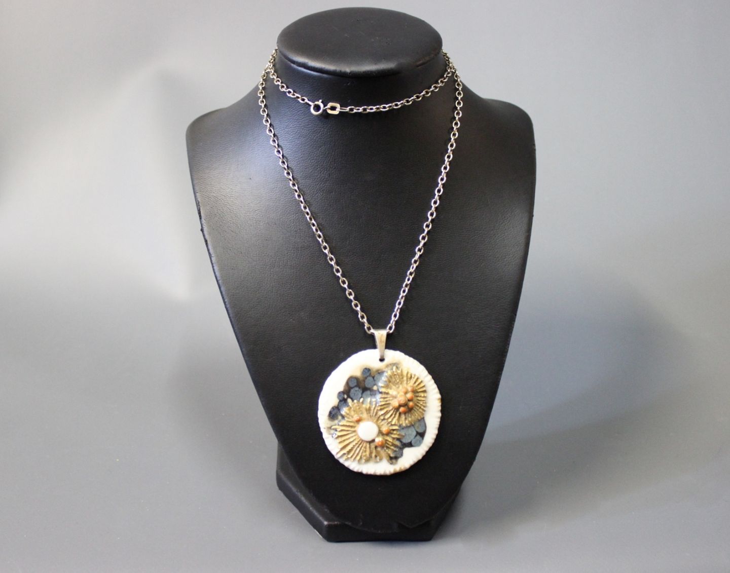 Kæden er 64 cm lang og vedhæng 5,5 cm i Dia.