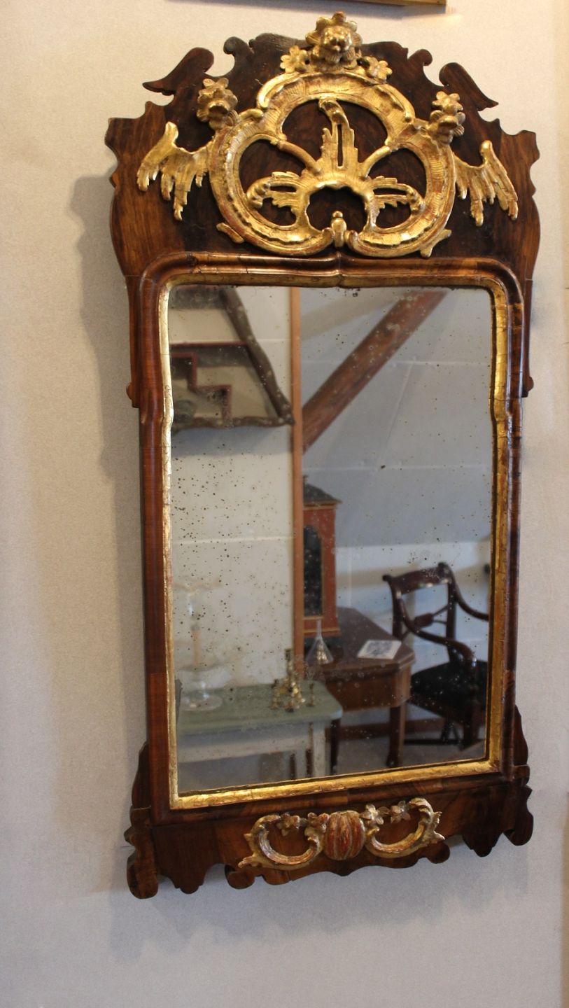 SolgtSpejl i Rokoko stil og nøddetræ. Spejlet er fra ca. 1740, Danmark og er i original stand.