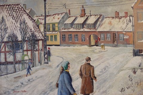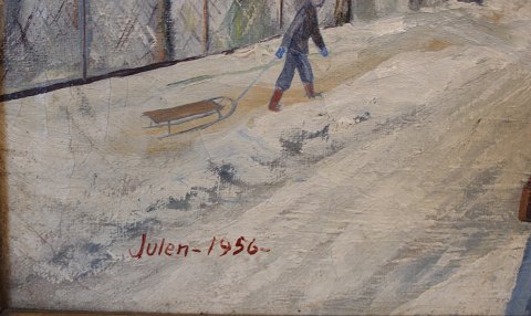 SoldOil painting titled "Christmas 1956" signed by Poul Vilhelm Larsen. The painting shows a snow covered Danish village.