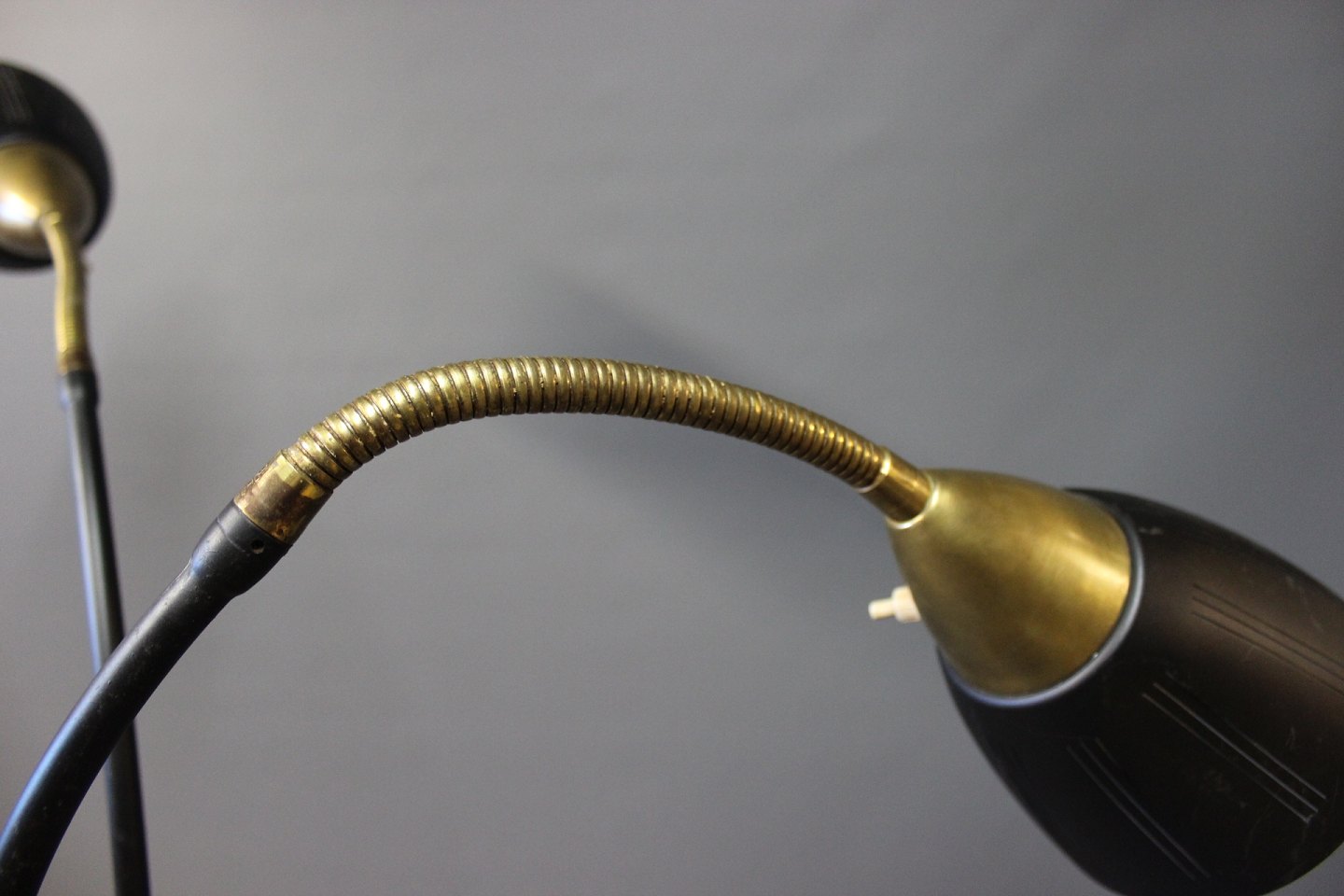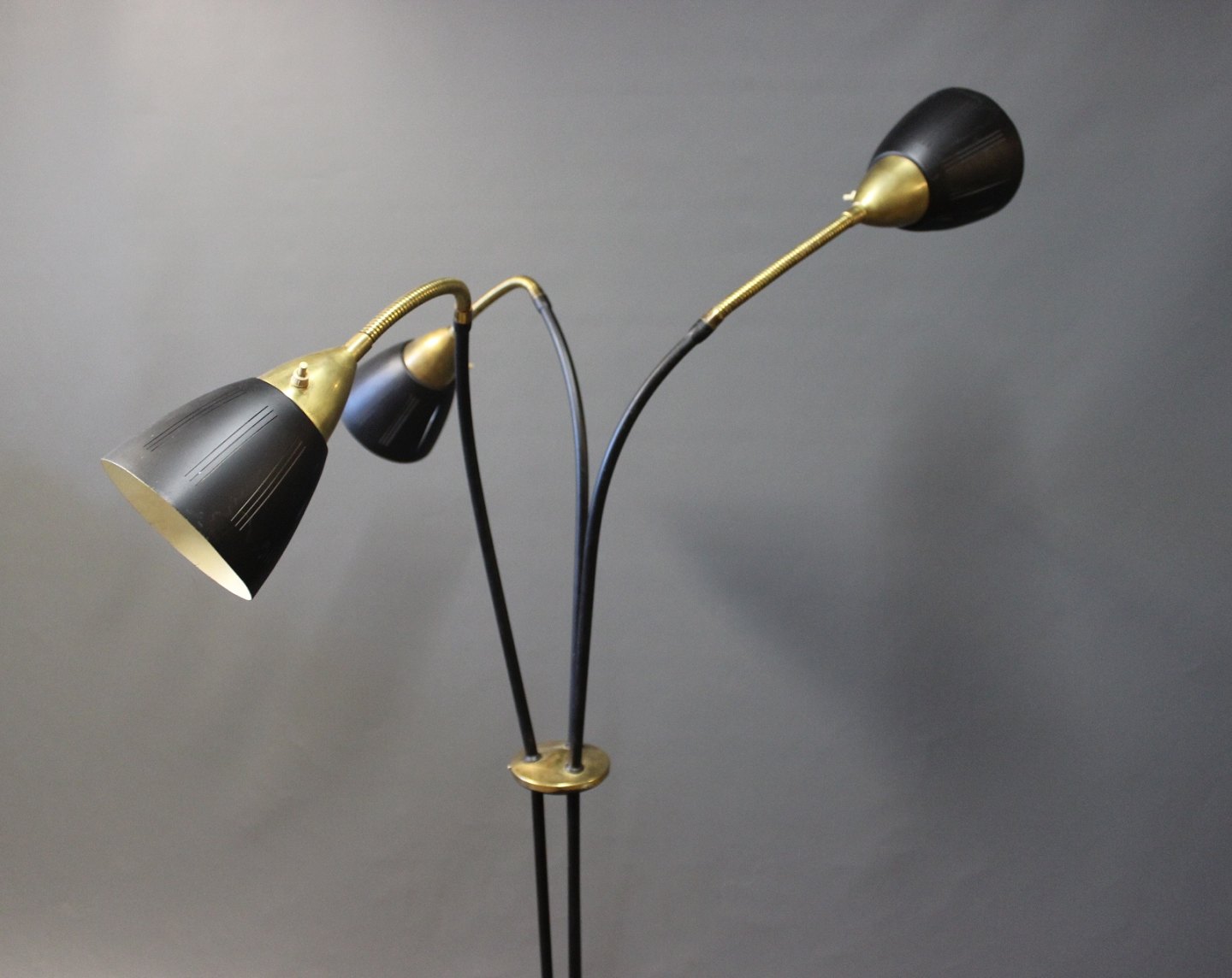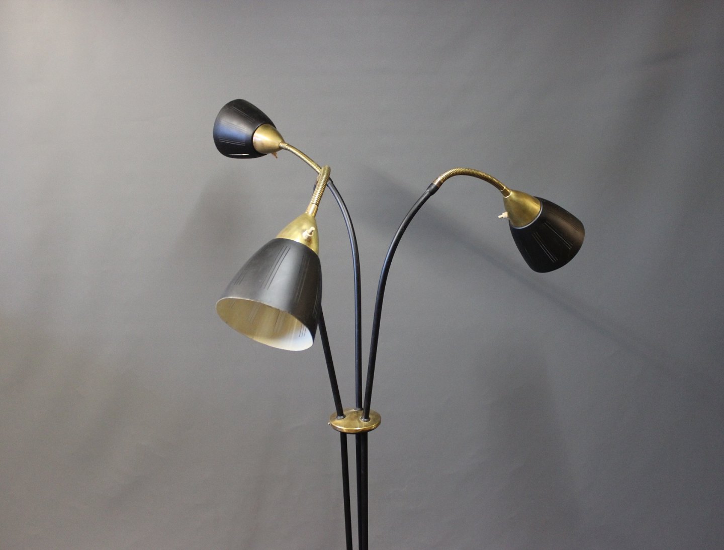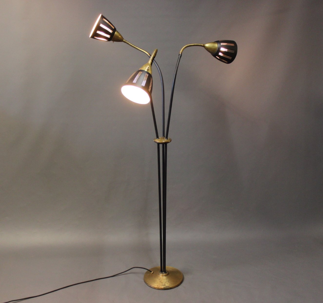 SolgtTrearmet sort gulvlampe i messing af ukendt design fra omkring 1930-40erne.