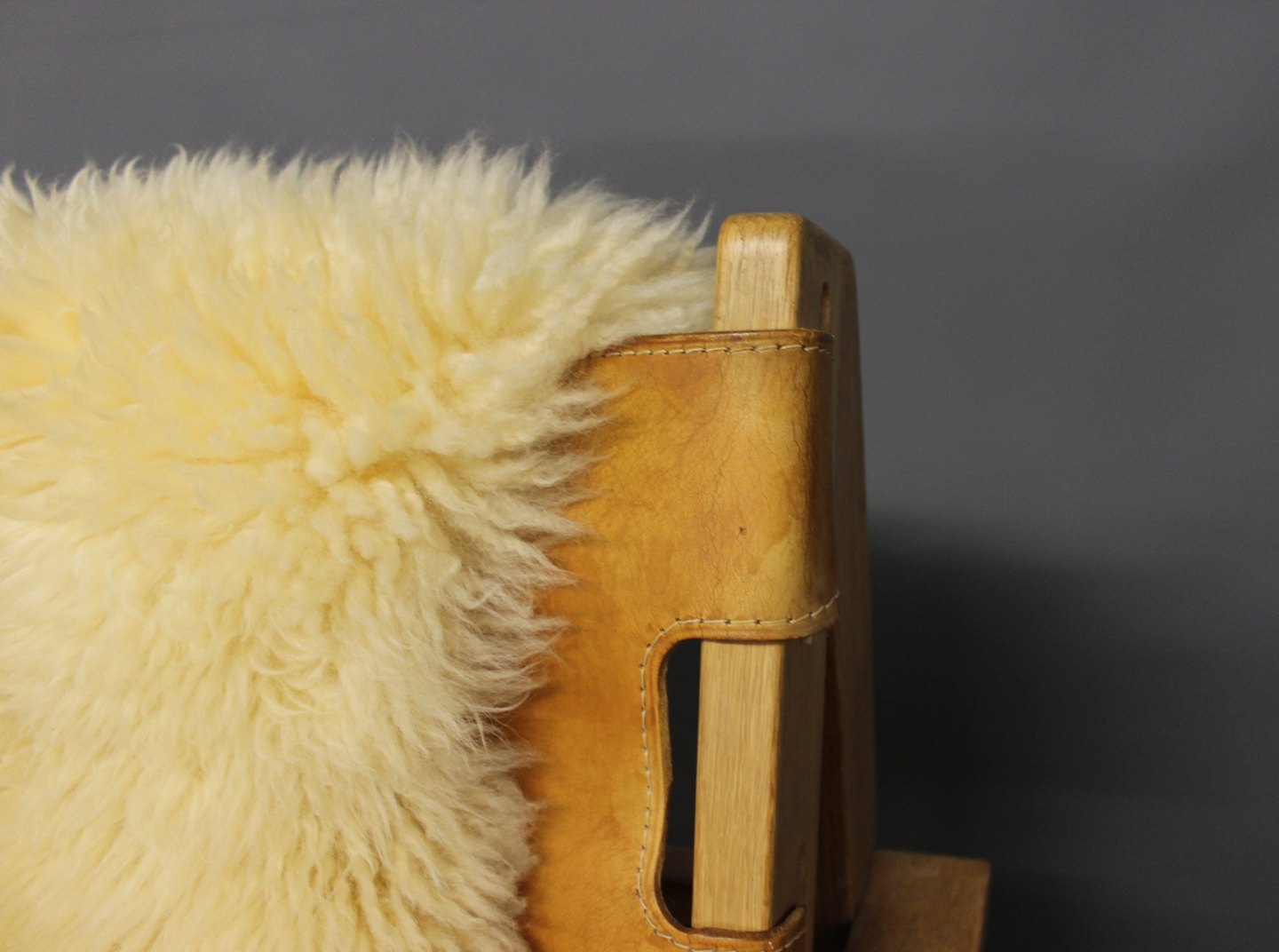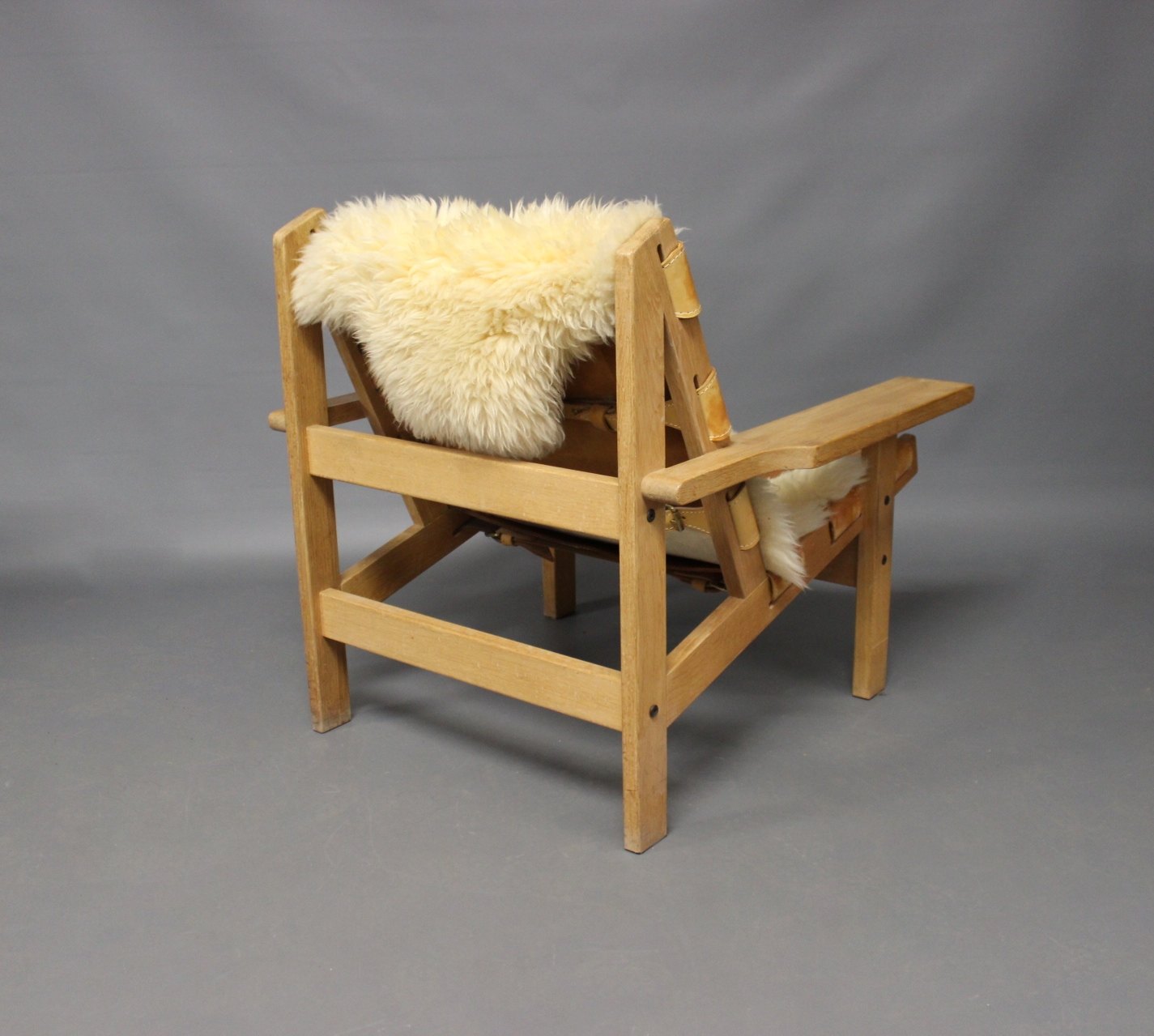 SoldA pair of easy chairs, model 168, designed by Kurt Østervig in soap treated oak and patinated leather with sheep skin.