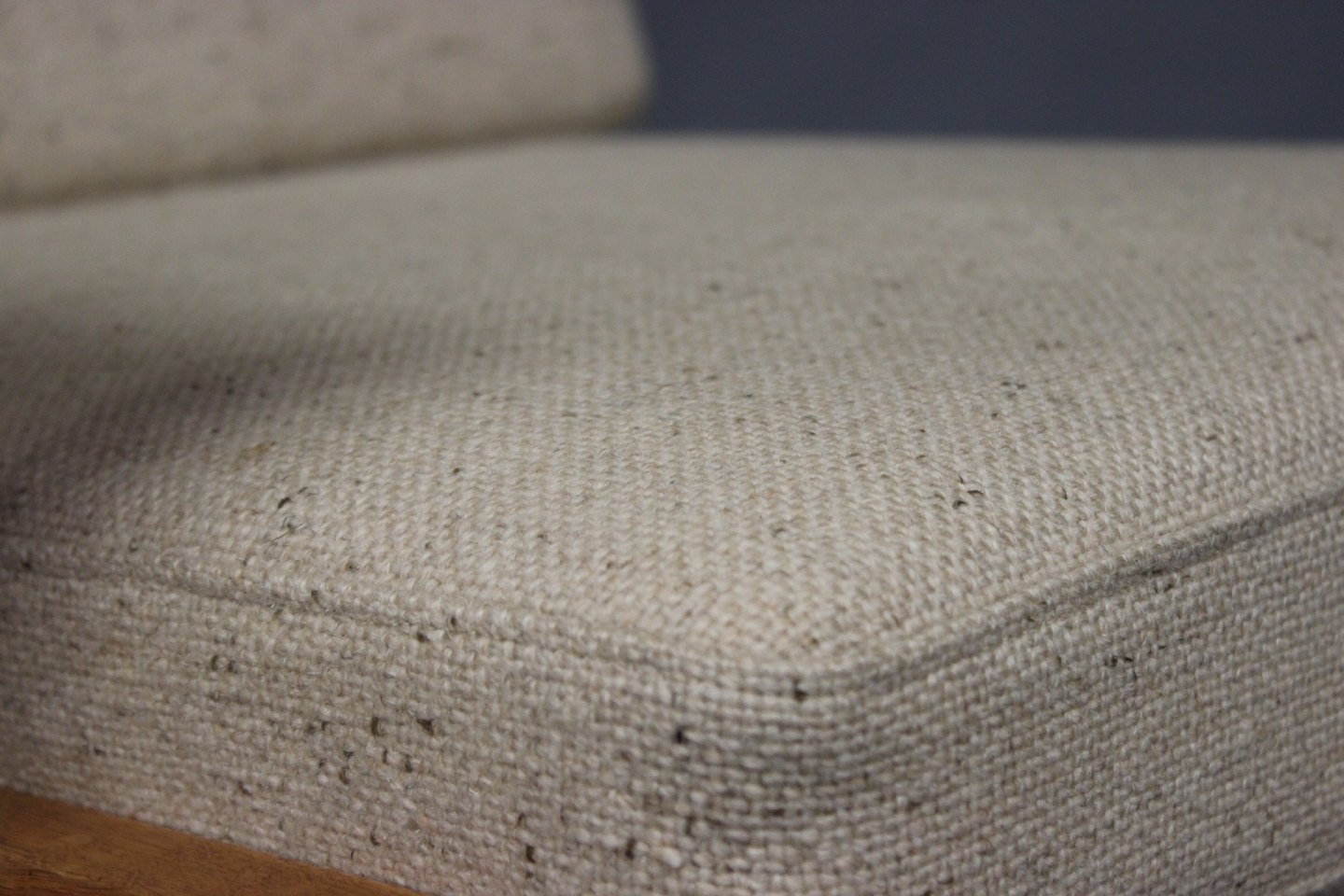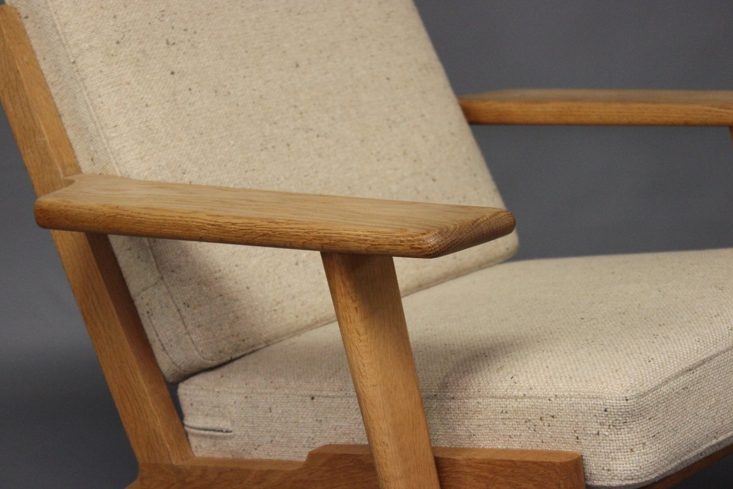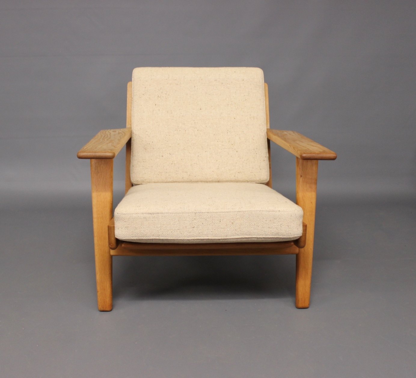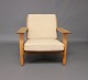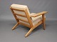 SolgtArmstol, model GE290, designet af Hans J. Wegner i 1950erne og fremstillet hos GETAMA i 1960erne. Stolen er af eg og hynder polstret af lyst Hallingdal uld.
