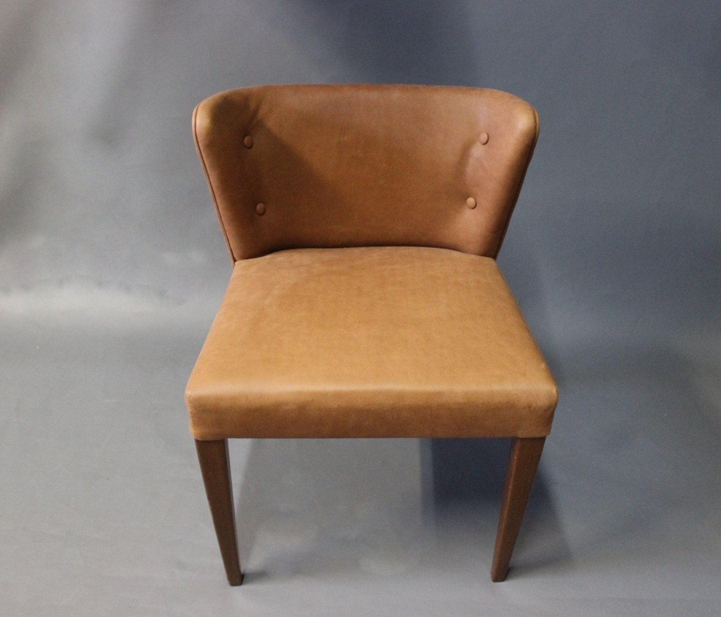 Denne stol af Egon Bro Pedersen har vi ompolstret samt ordnet træværket efter kraftig brandskade.