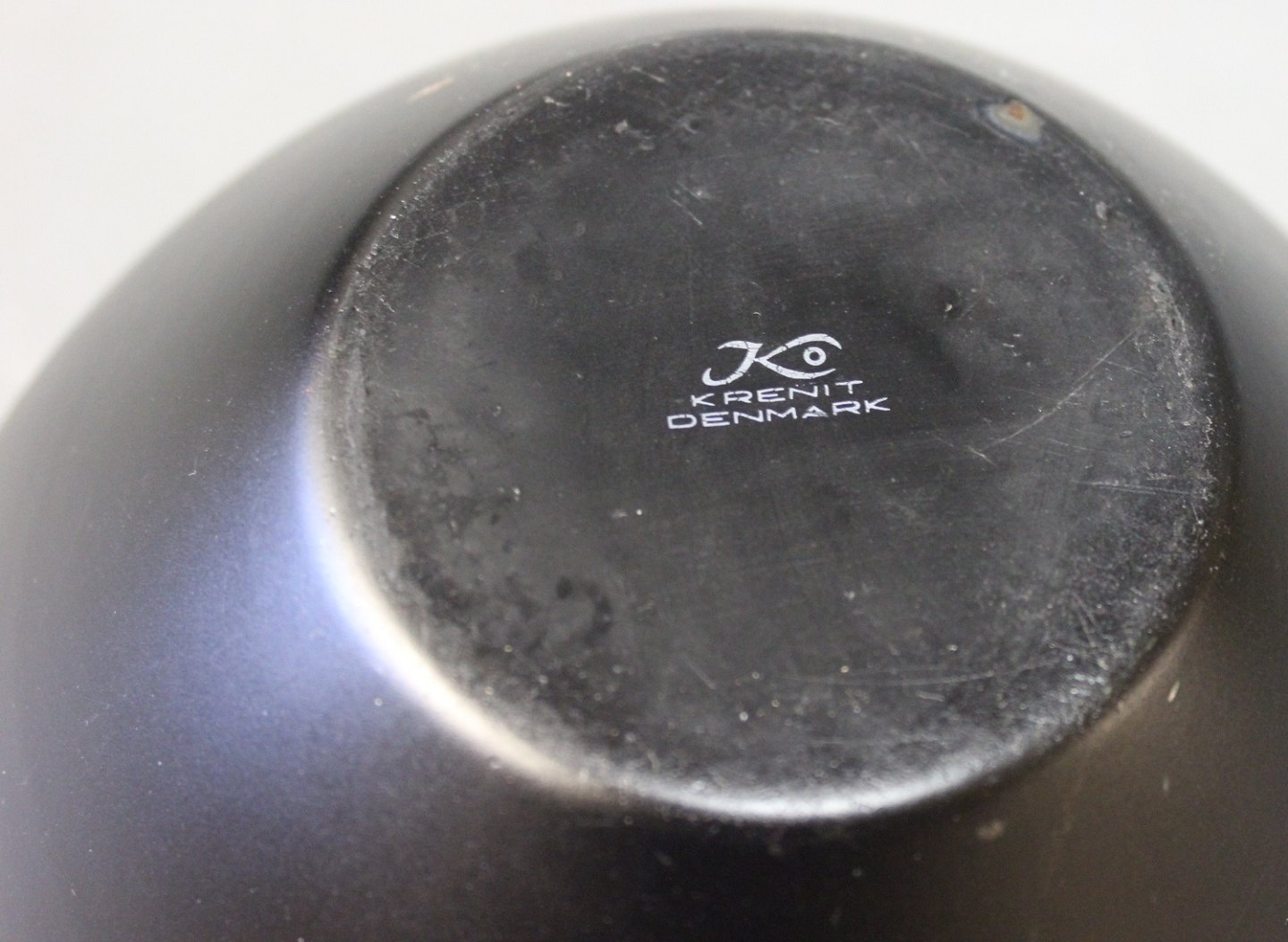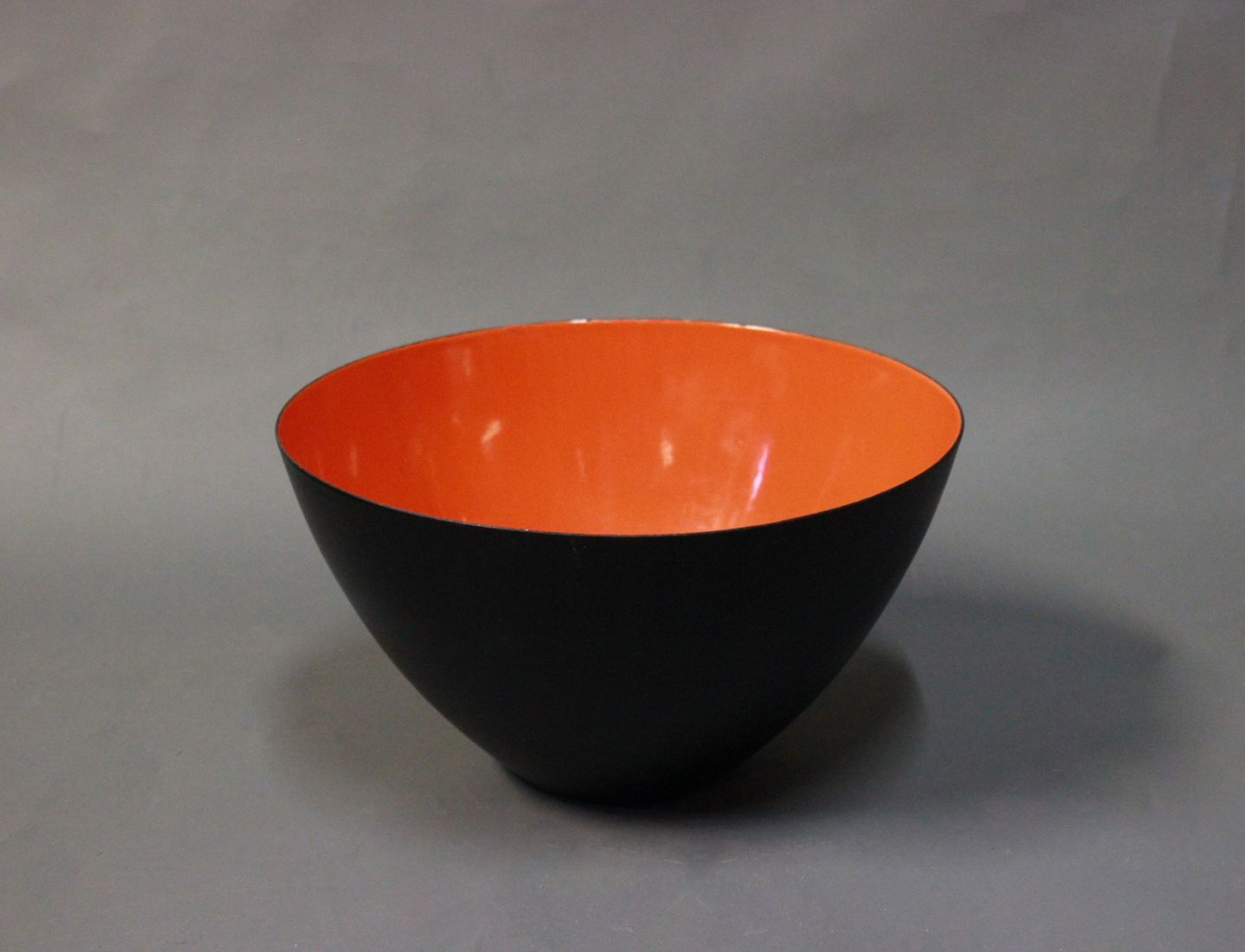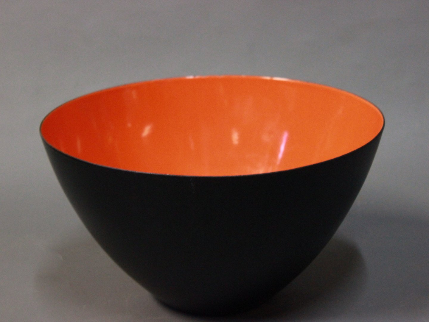 SolgtKrenit skål af Herbert Krenchel i sort metal og orange/rød emalje. Skålen er fra 1960erne.