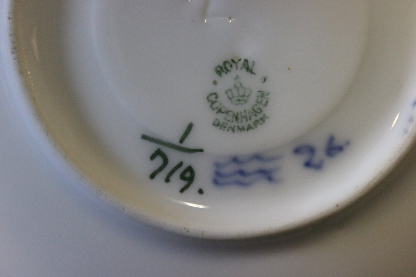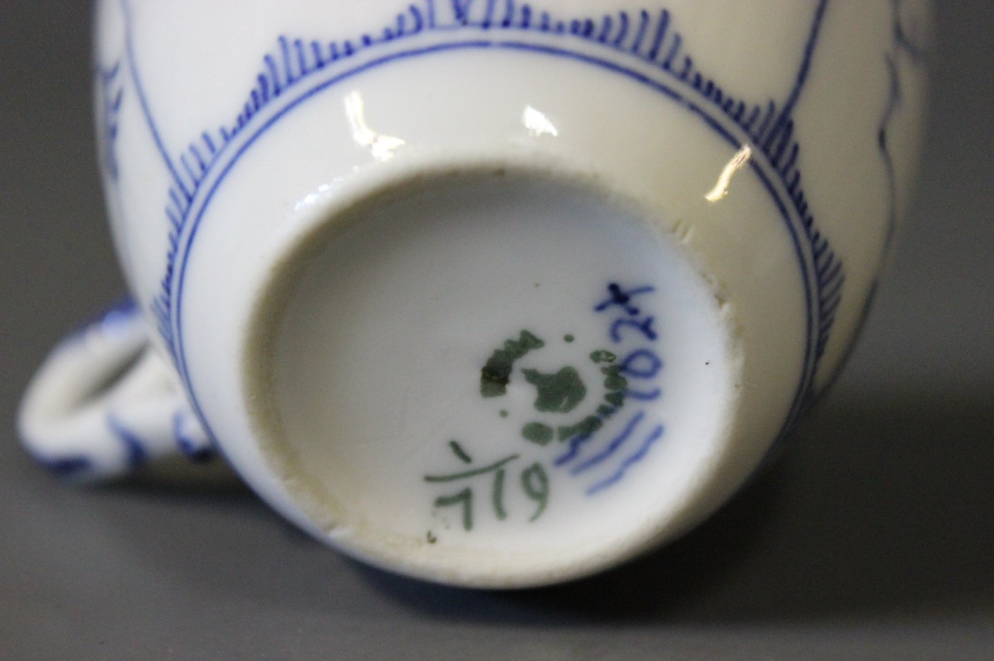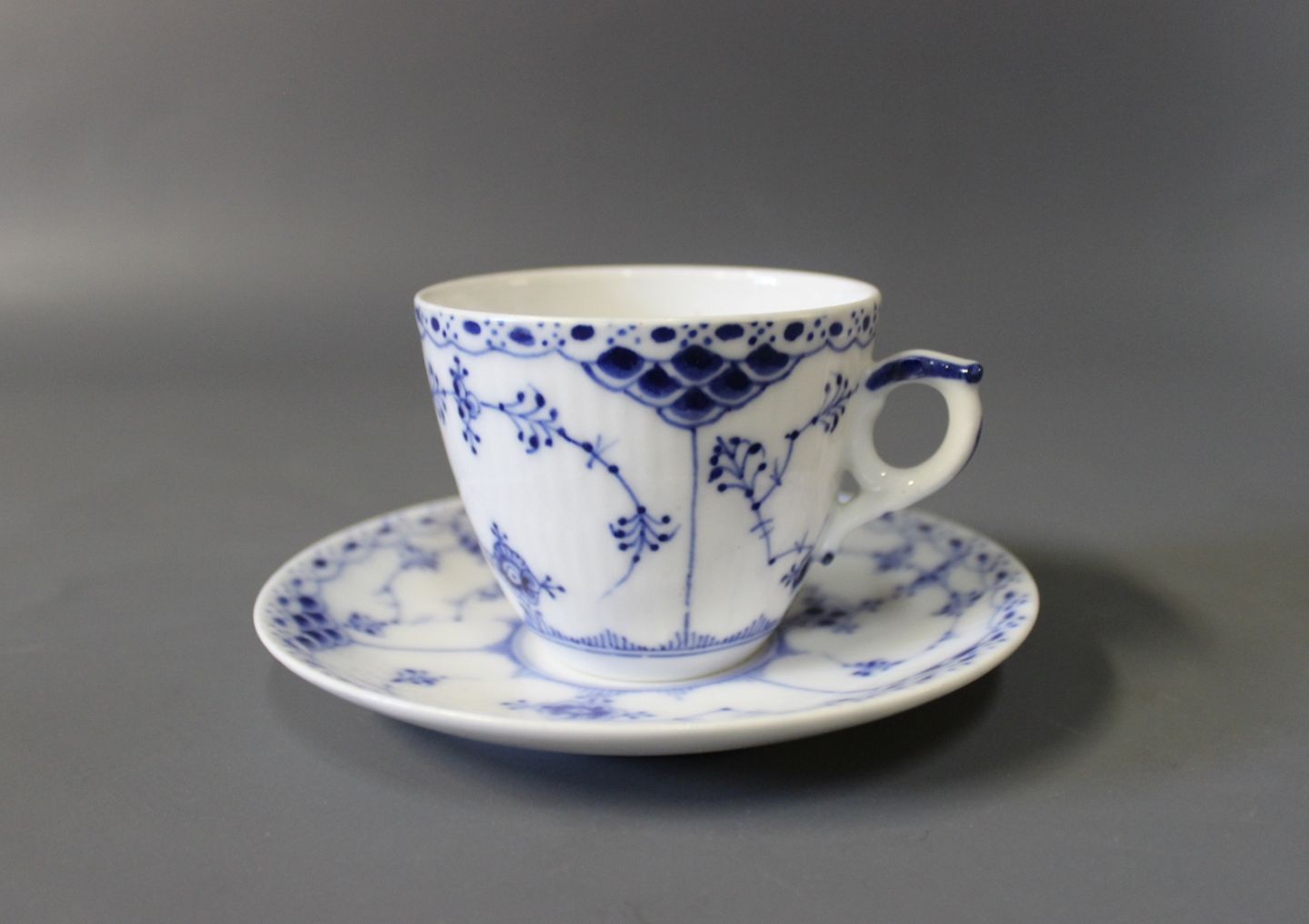 Kgl. musselmalet halvblonde lille kaffekop med underkop, nr.: 1/719.