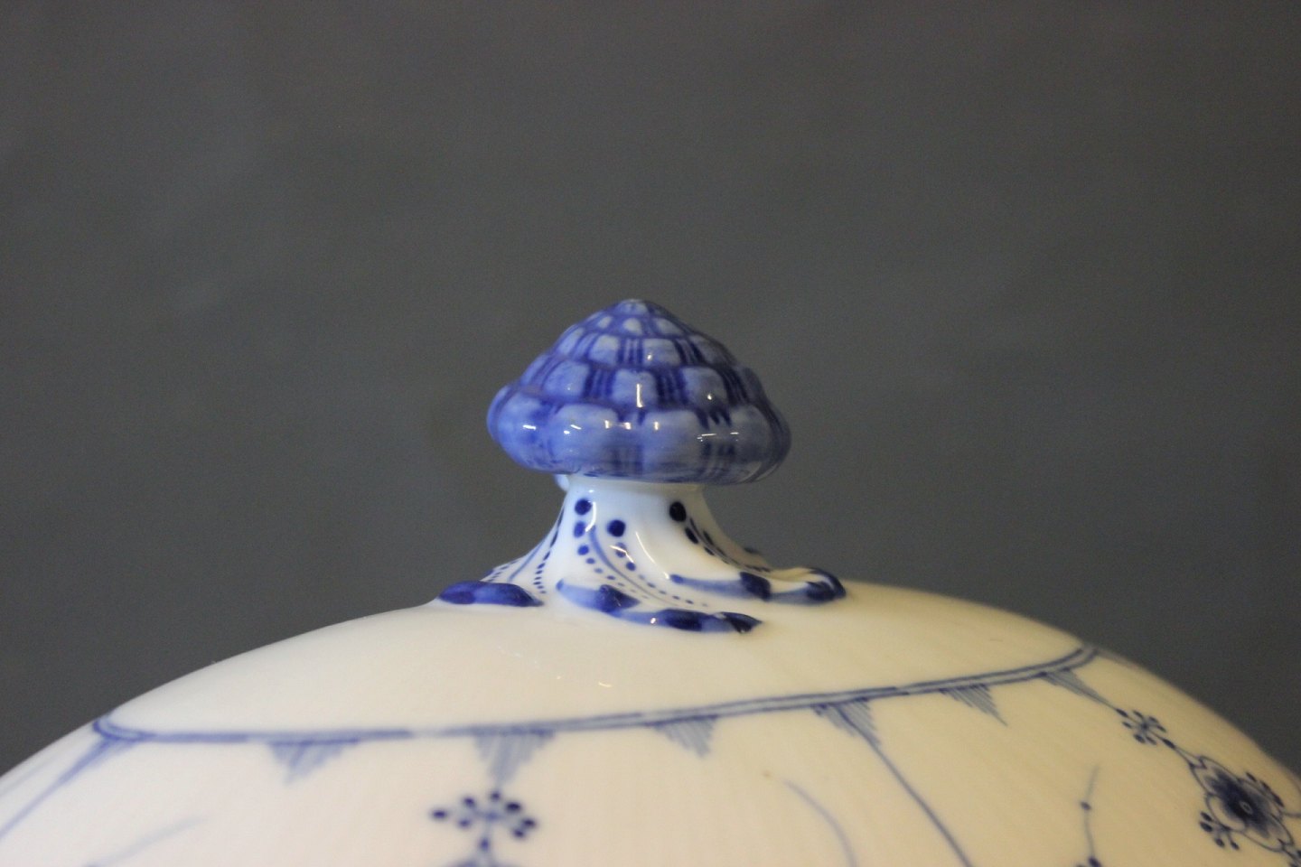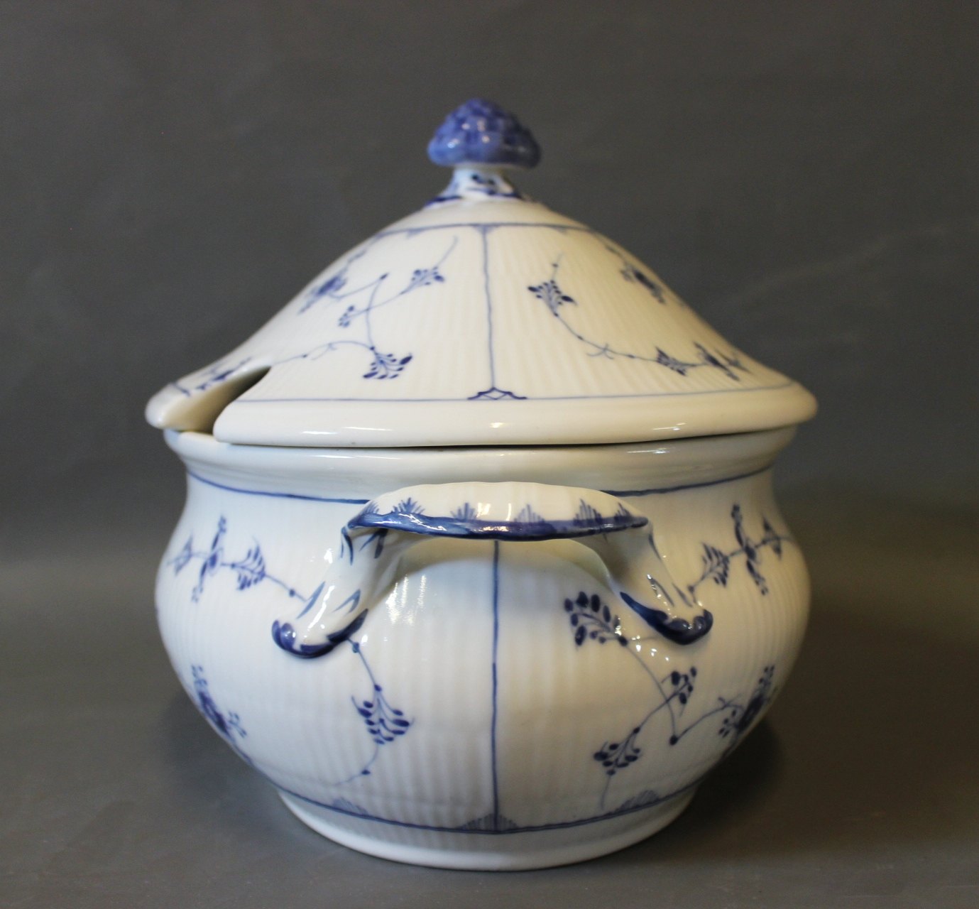 SolgtKgl. Musselmalet riflet stor terrin, nr.: 1/215.