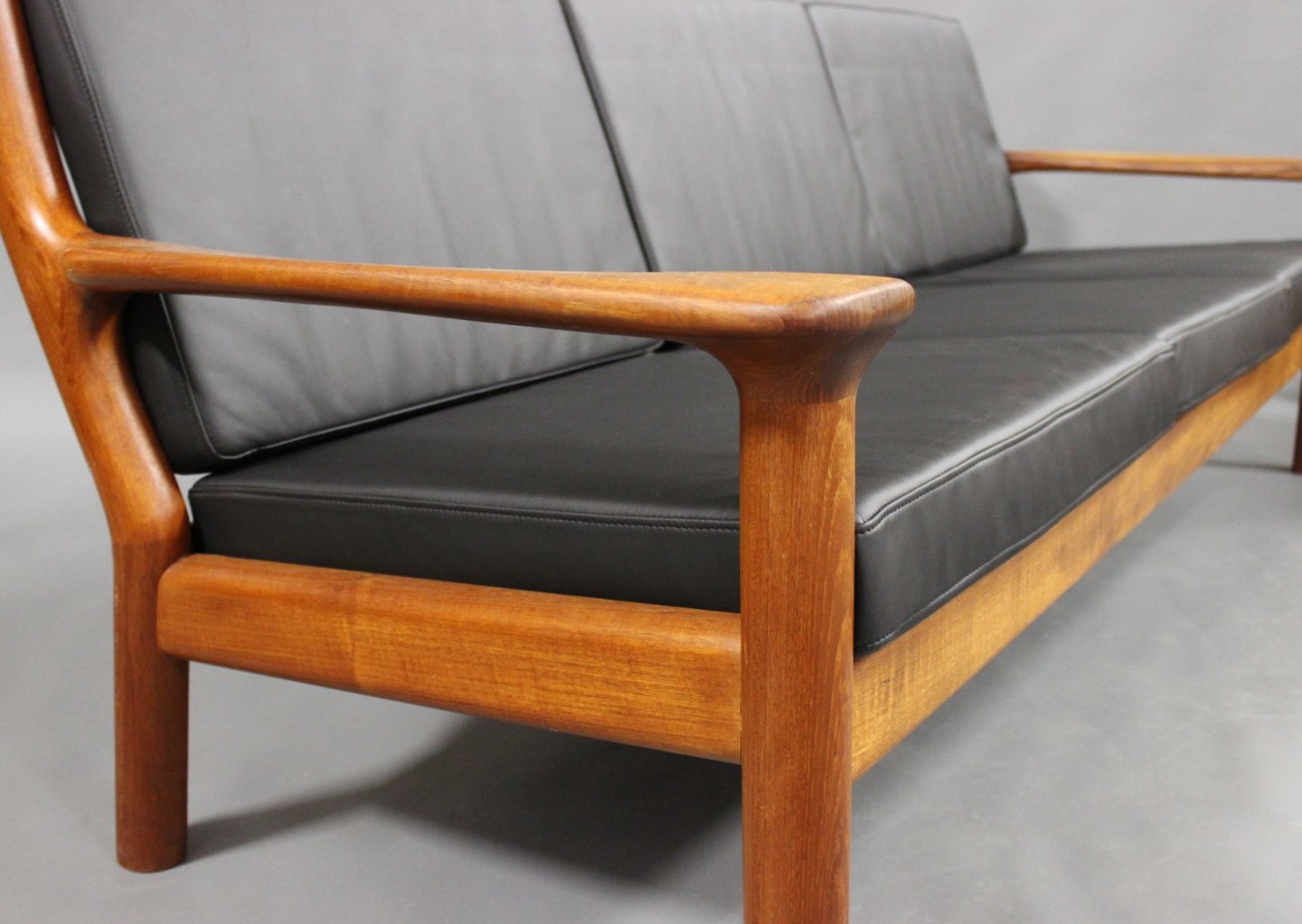 Sold3 seather sofa in teak and cushions of black leather designed by Juul Kristensen and manufactured by Glostrup Furniture Factory from the 1960s.