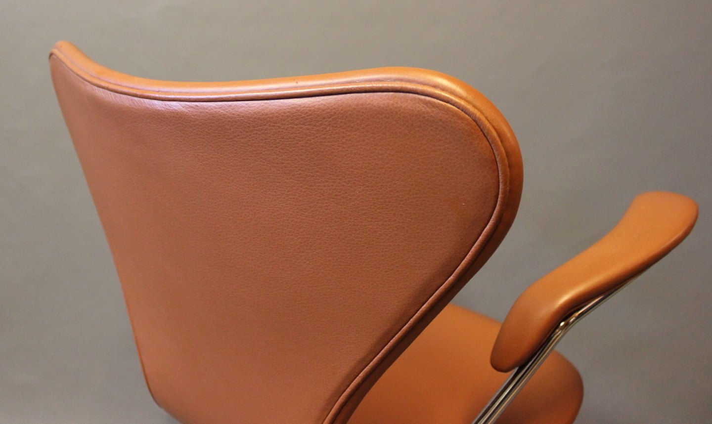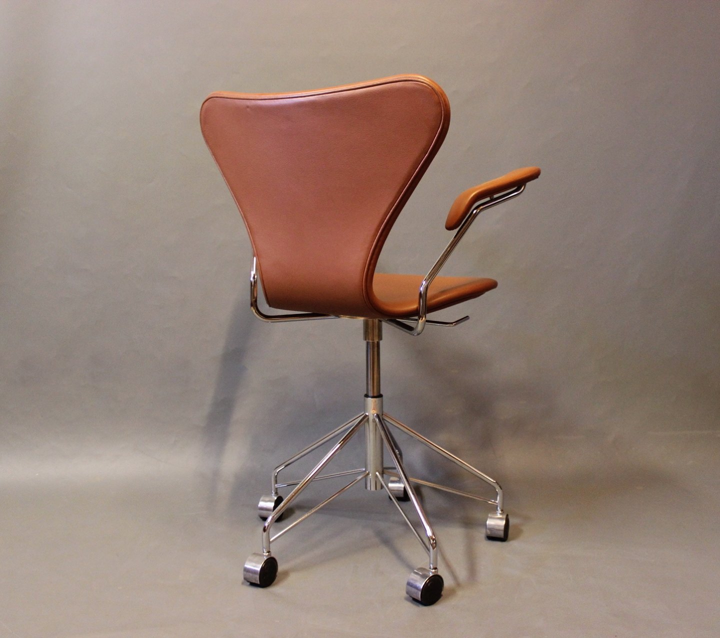 Sold"Seven" office chair, model 3217, with armrests and swivel function in cognac colored leather designed by Arne Jacobsen in the 1950s and manufactured by Fritz Hansen.