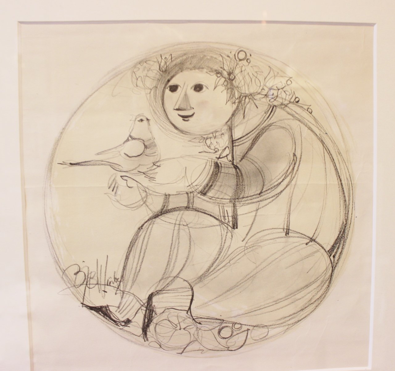 SoldLithographic print of lady with bird signed by Bjørn Wiinblad in silver frame.