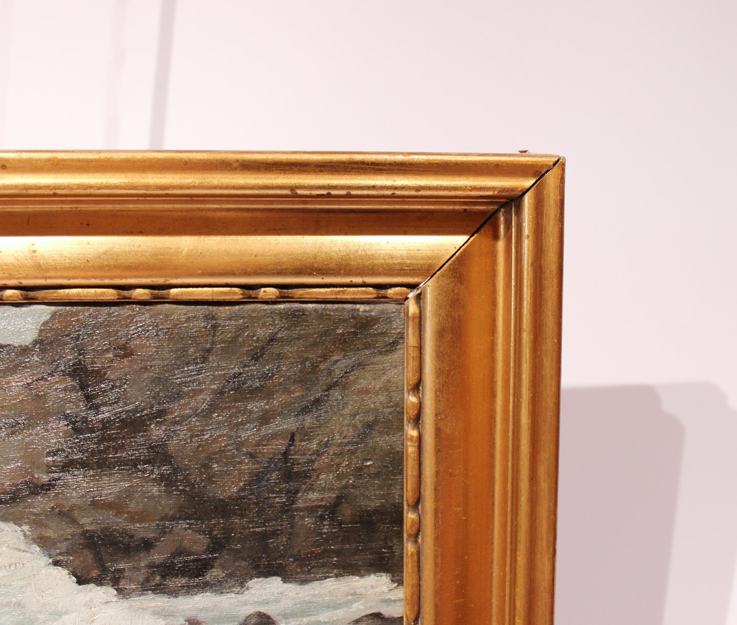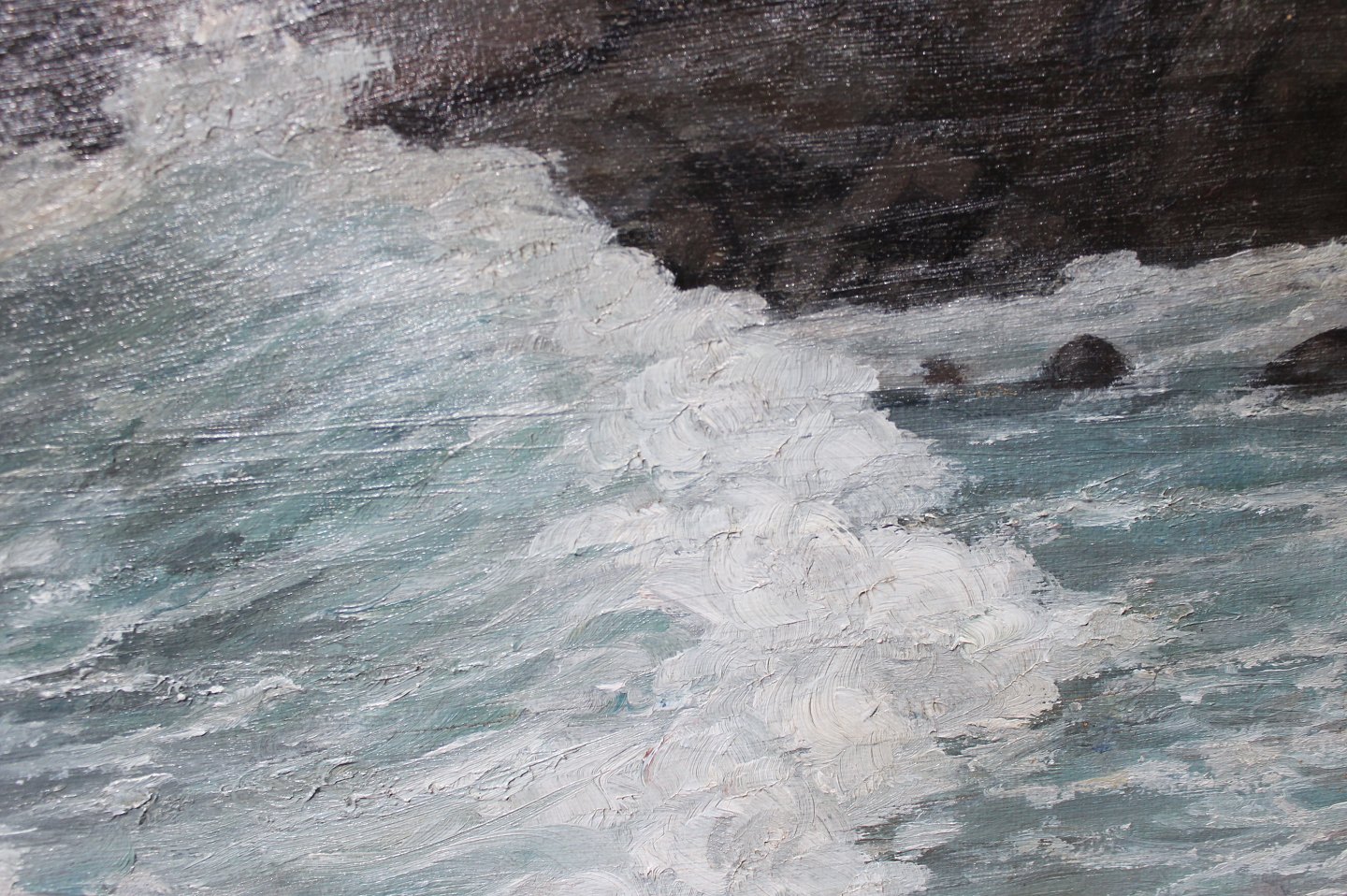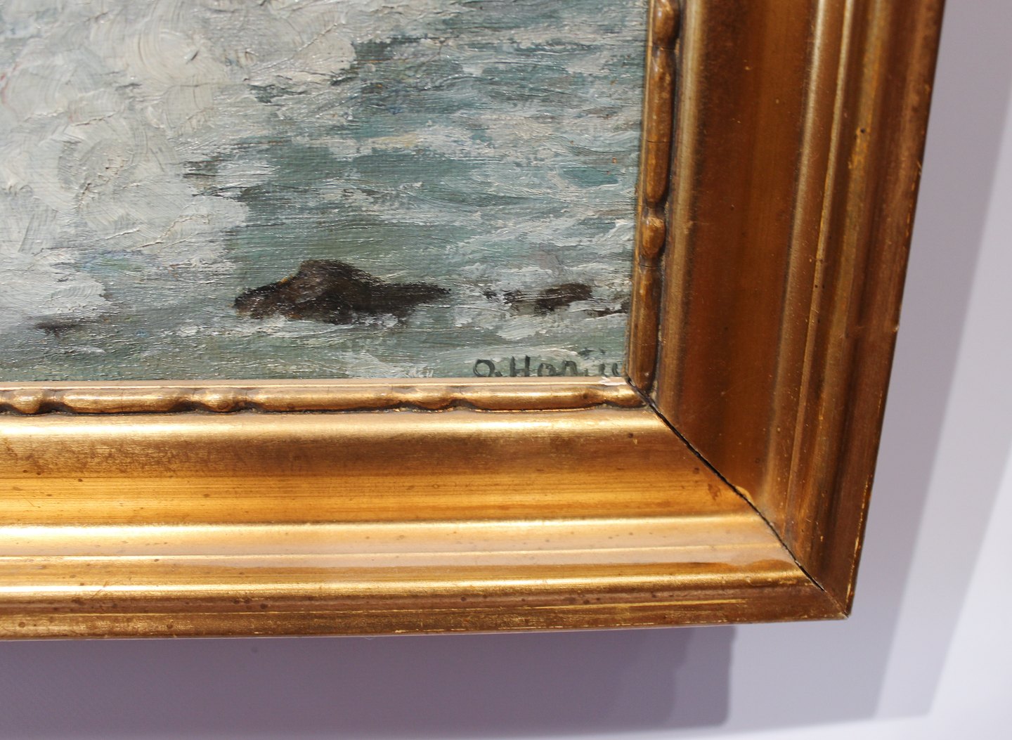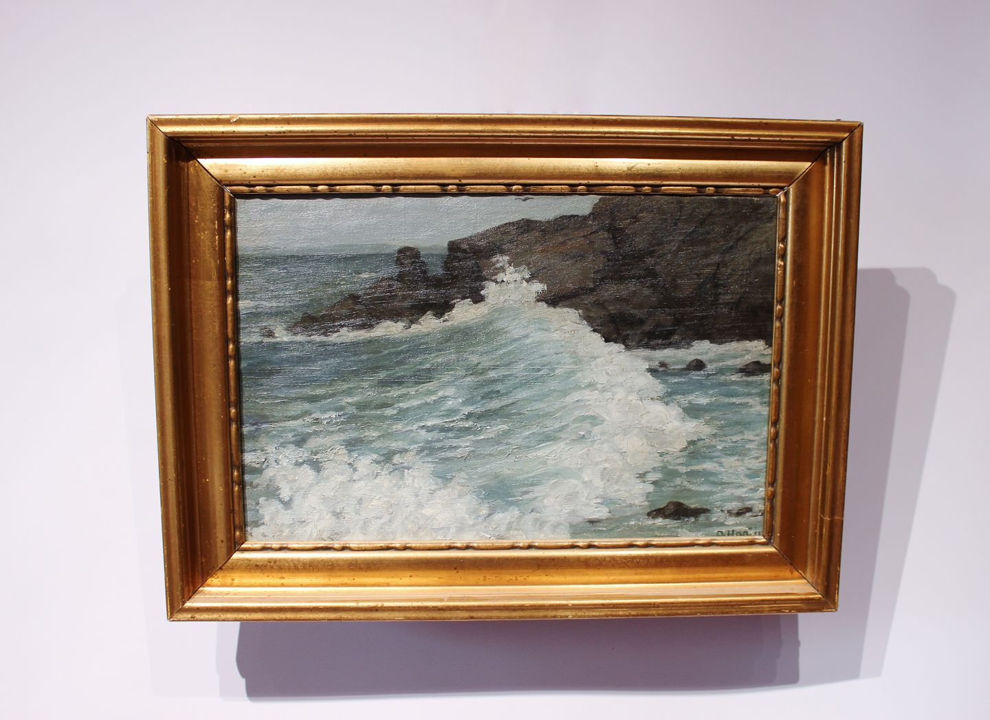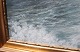 SolgtOliemaleri med motiv af bølger på en dansk stand og med forgyldt ramme. Maleriet er signeret af en ukendt dansk kunstner.