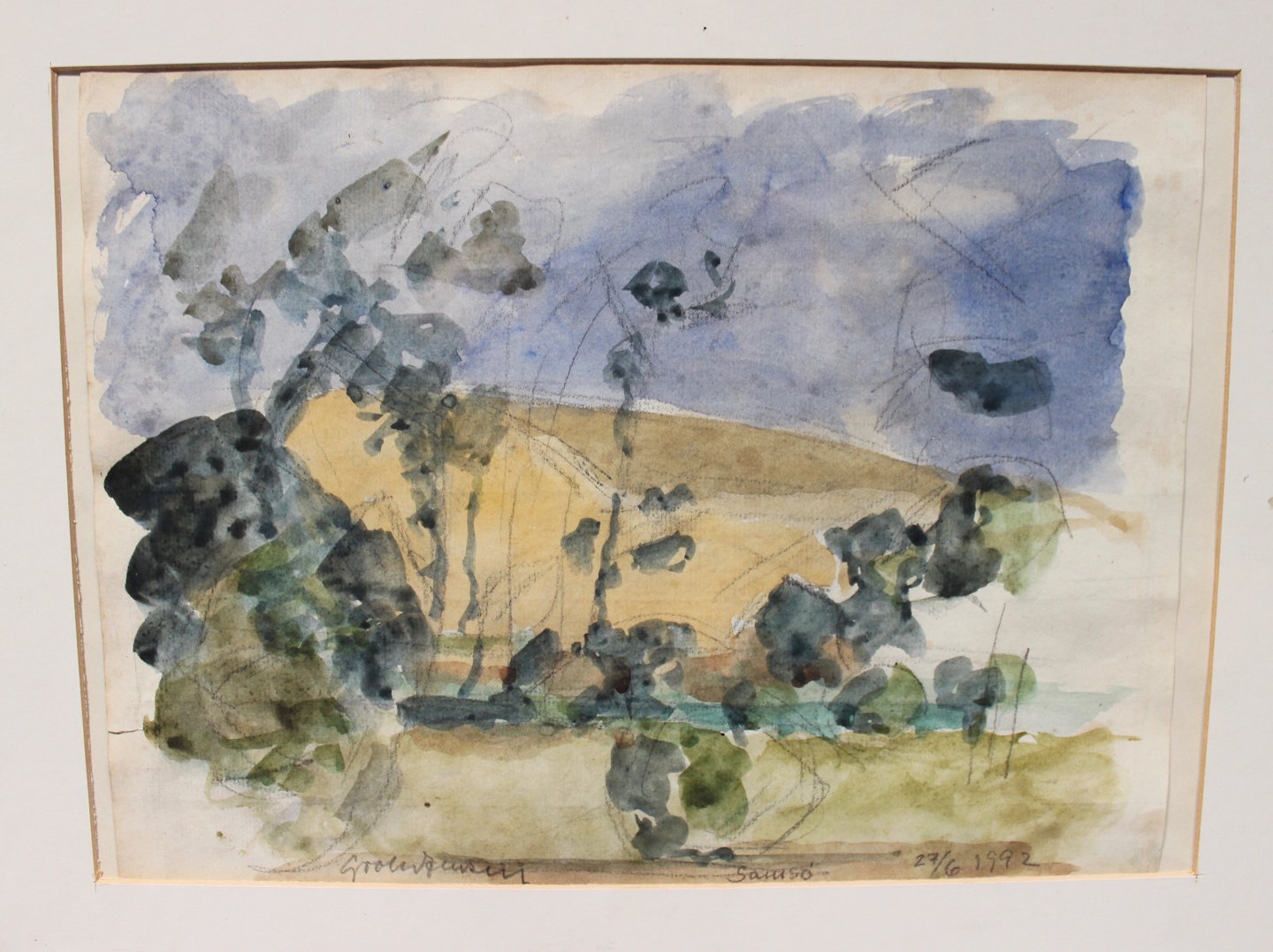 Akvarel i blå og grønne farver af Samsø signeret Jens Peter Groth Jensen fra 27/6-1992.