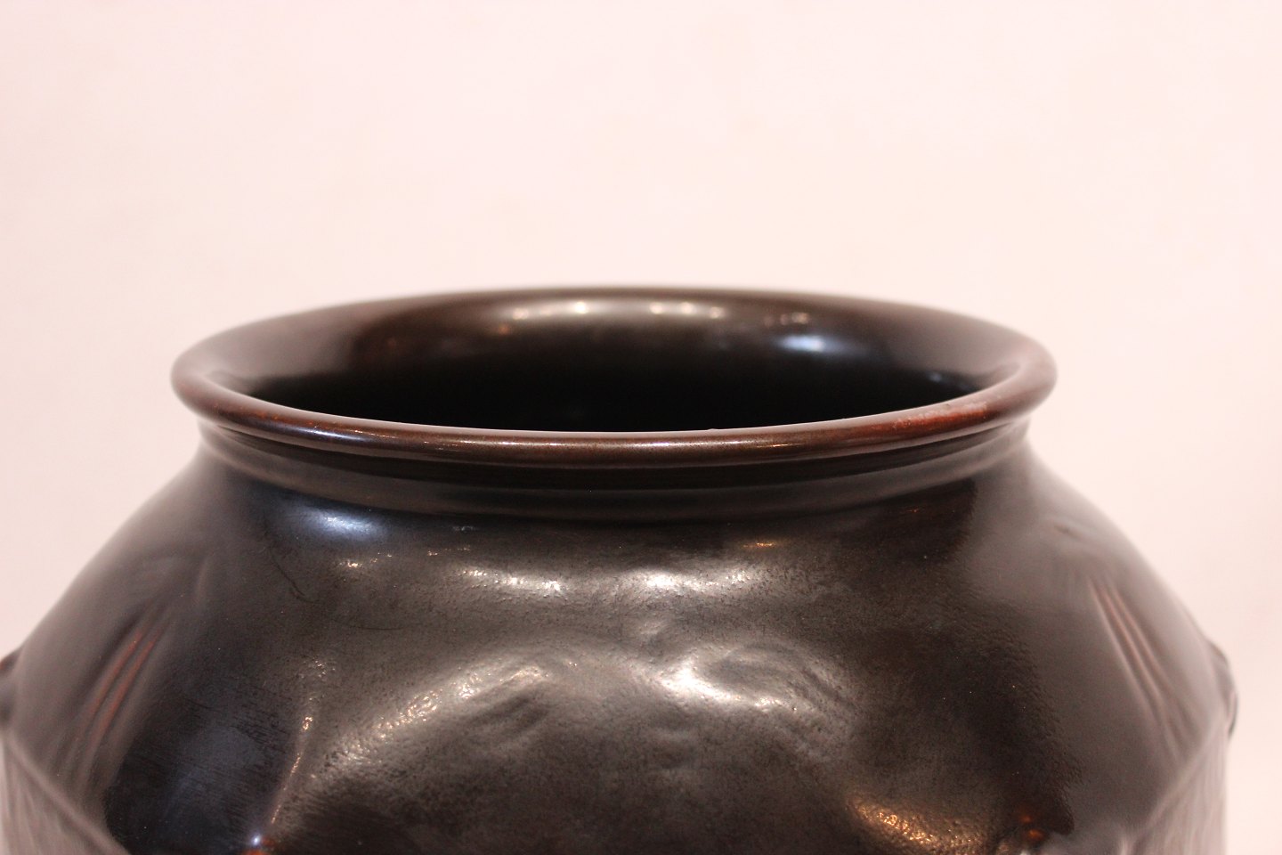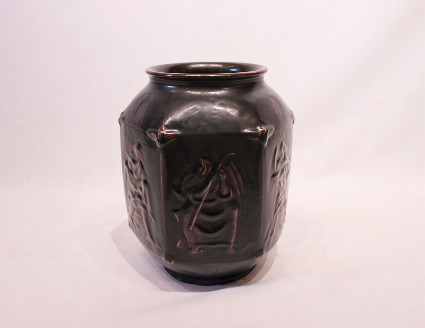 SolgtKongelig stentøj gulvvase i mørk glas med motiver signeret af Jais Nielsen og nummeret 2222. Vasen er i flot brugt stand.