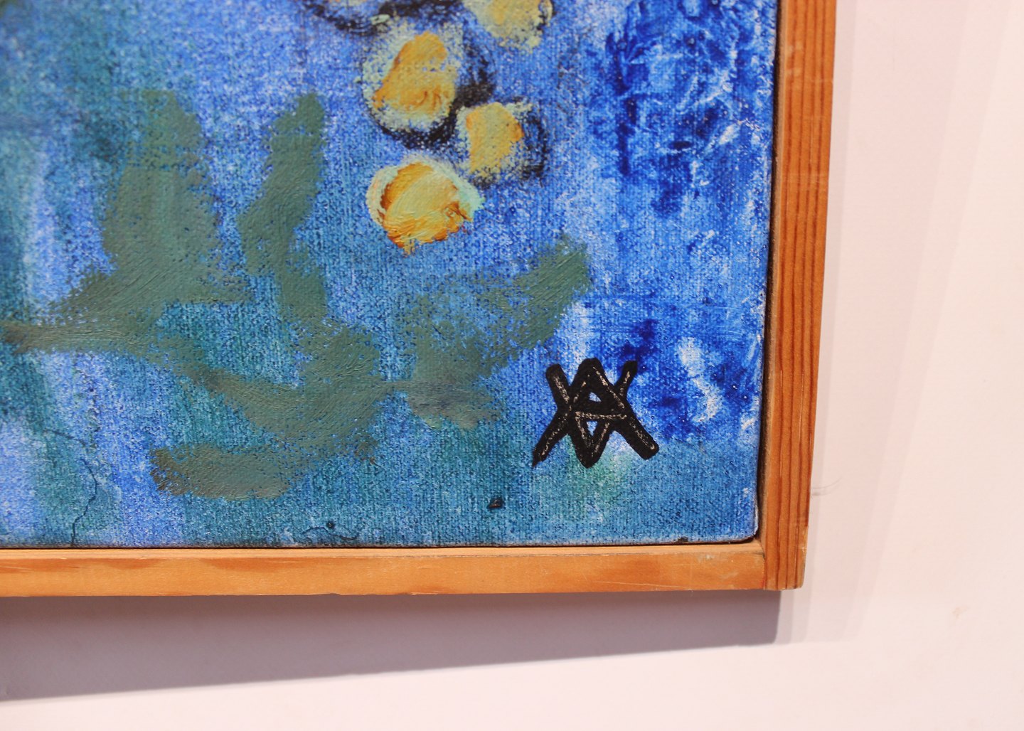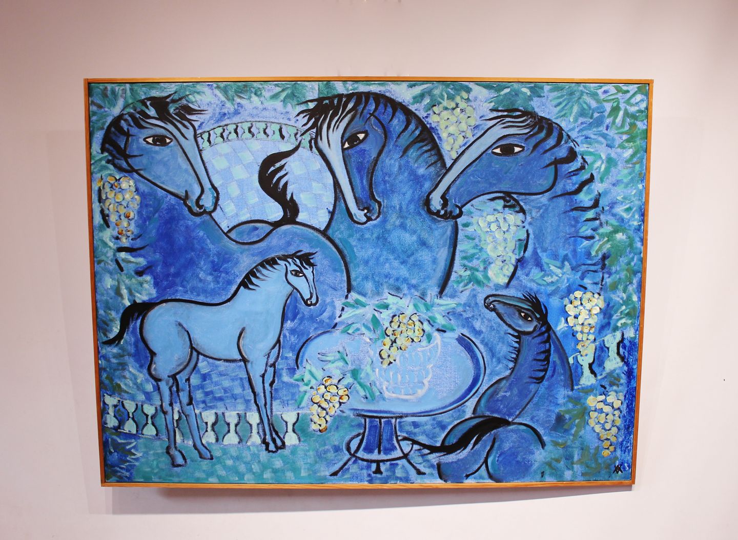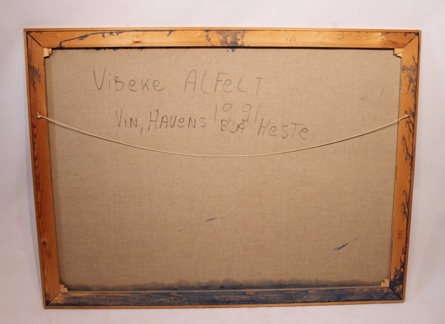 SoldPainting on canvas called "The vineyard's blue horses" by Vibeke Alfelt from 1991. The painting is in great vintage condition. Vibeke Alfelt is the daughter of the two danish artists Else Alfelt and Carl-Henning Pedersen.