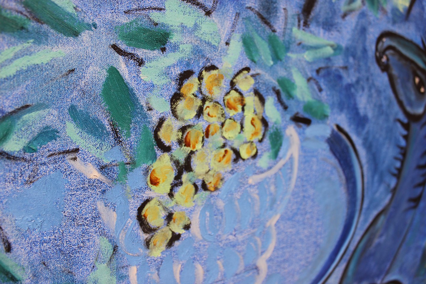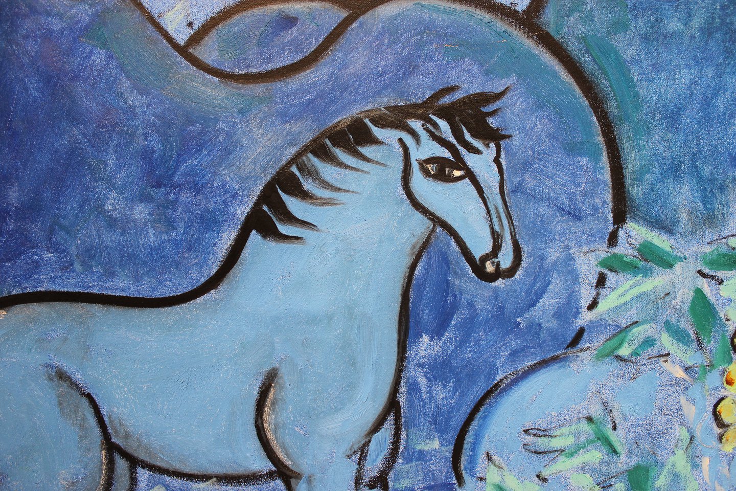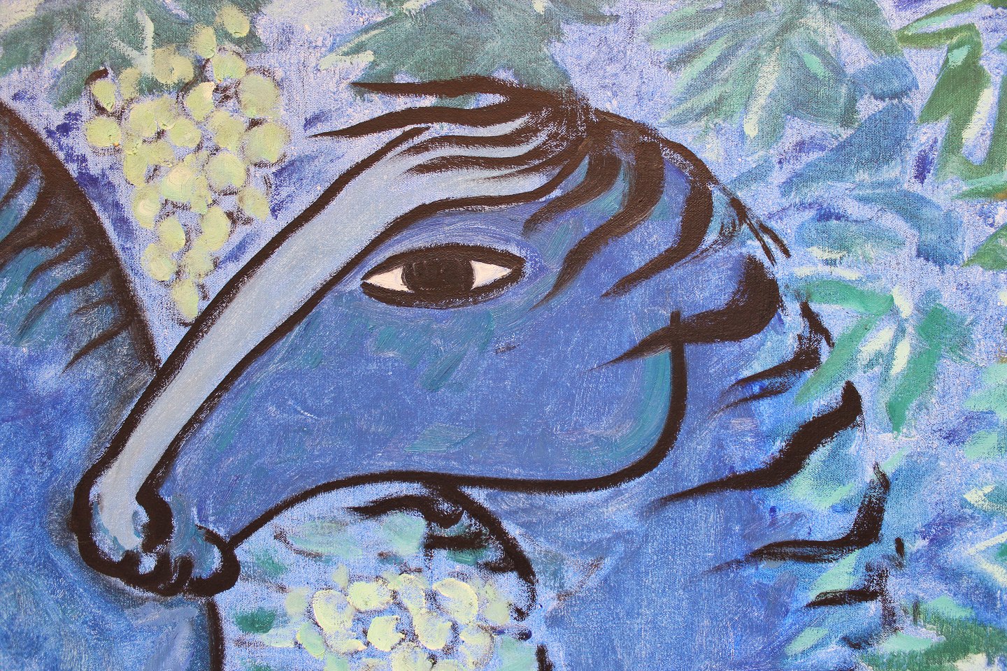 SoldPainting on canvas called "The vineyard's blue horses" by Vibeke Alfelt from 1991. The painting is in great vintage condition. Vibeke Alfelt is the daughter of the two danish artists Else Alfelt and Carl-Henning Pedersen.