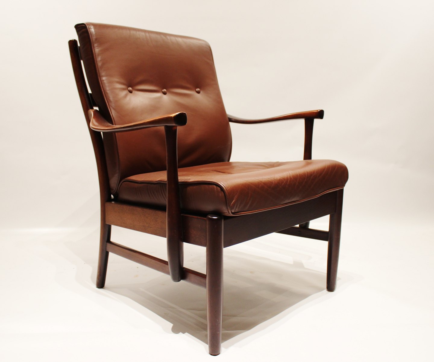 Et sæt lænestole af poleret træ og mørkebrunt læder, dansk design fra 1960erne.