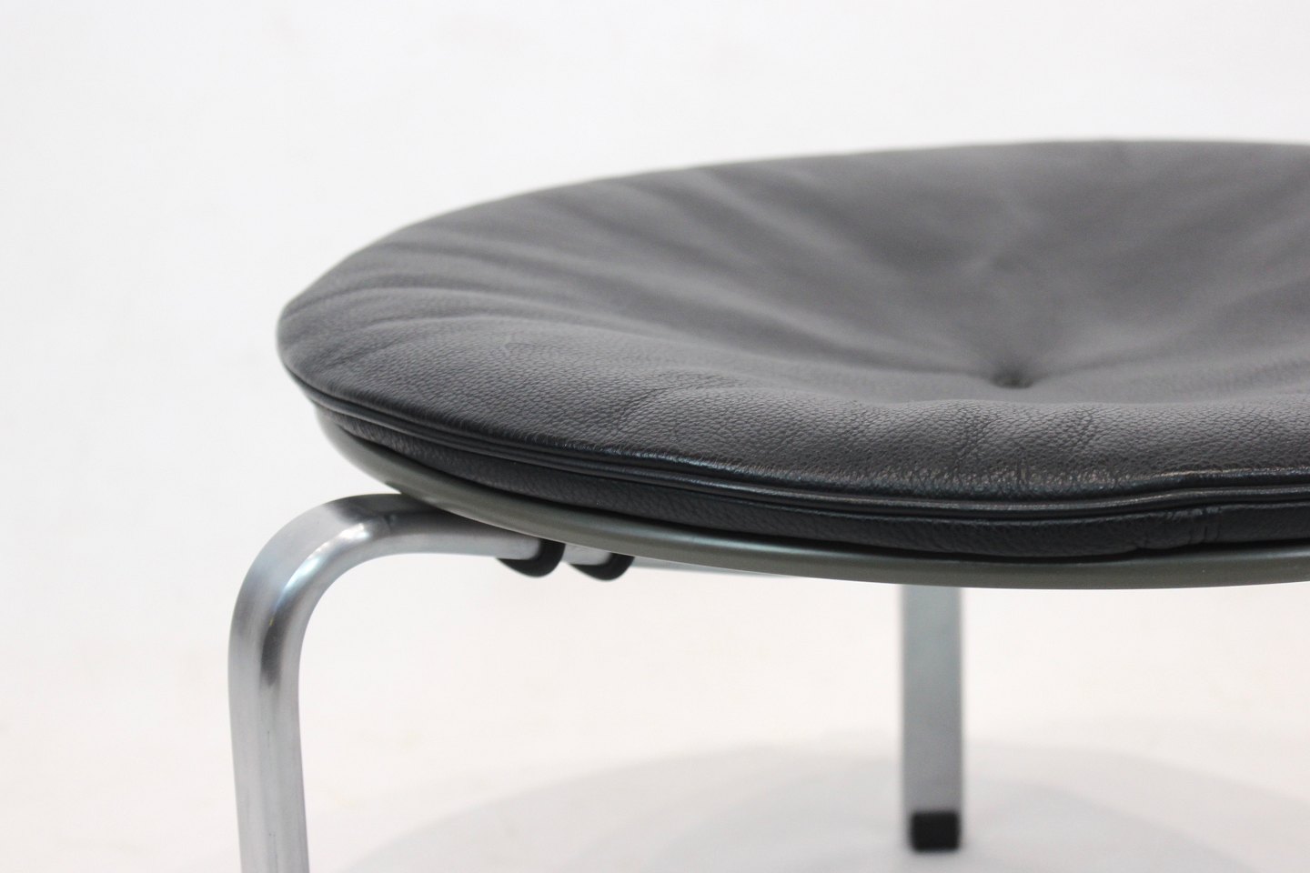 SolgtSkammel, model PK33, med sæde af sort klassisk læder og stel af matforkromet fjederstål, designet af Poul Kjærholm og fremstillet af Fritz Hansen i 2004. Skamlen er i flot brugt stand.