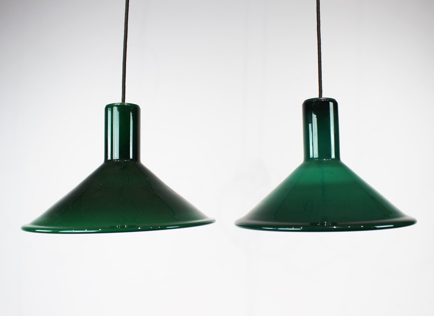SolgtEt par mørkegrønne P&T glas pendler af Michael Bang for Holmegaard. Lamperne er i flot brugt stand.