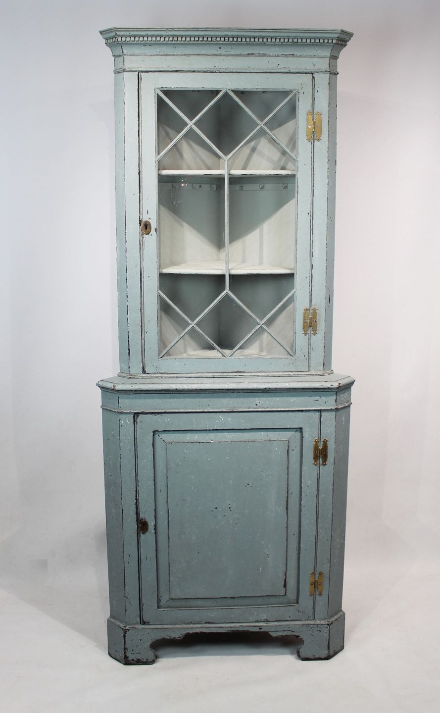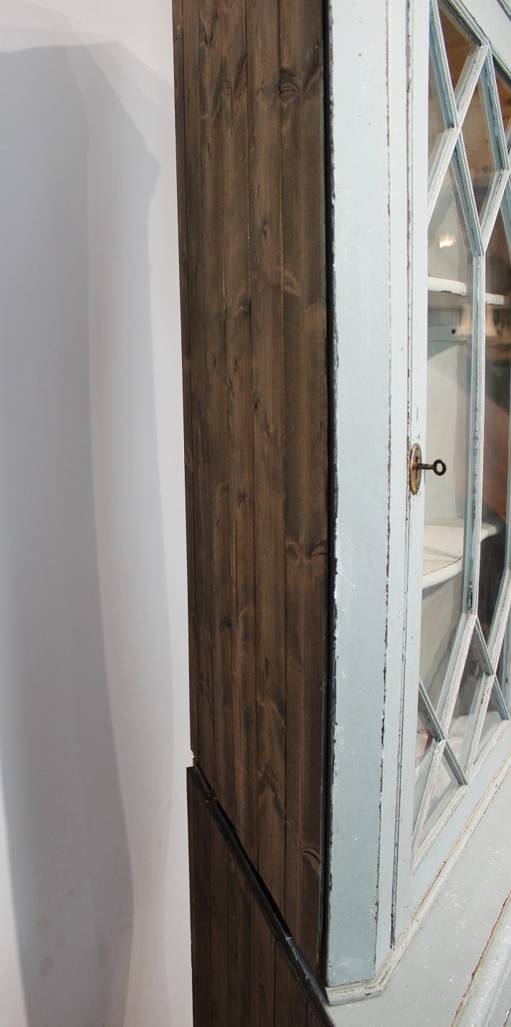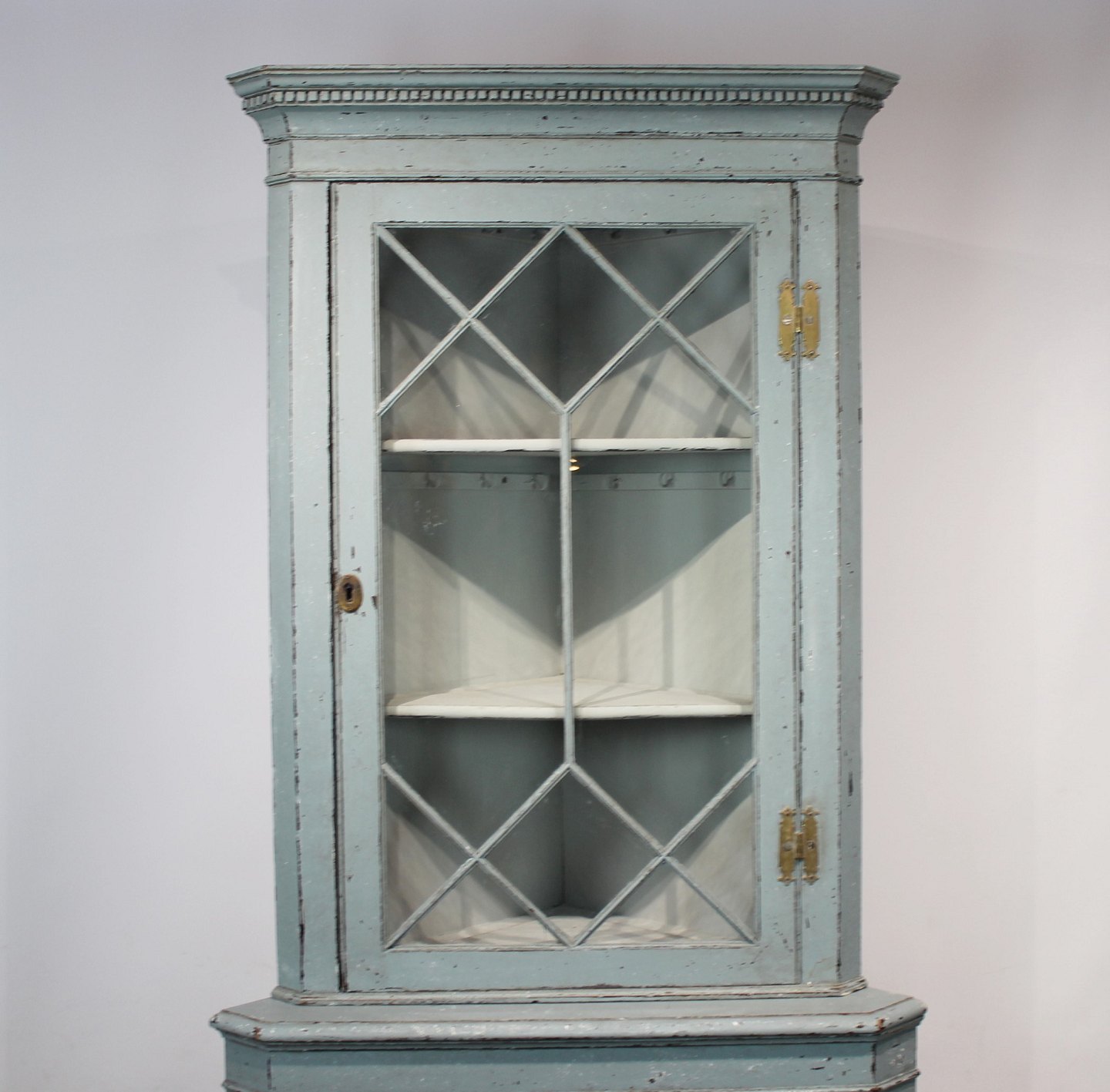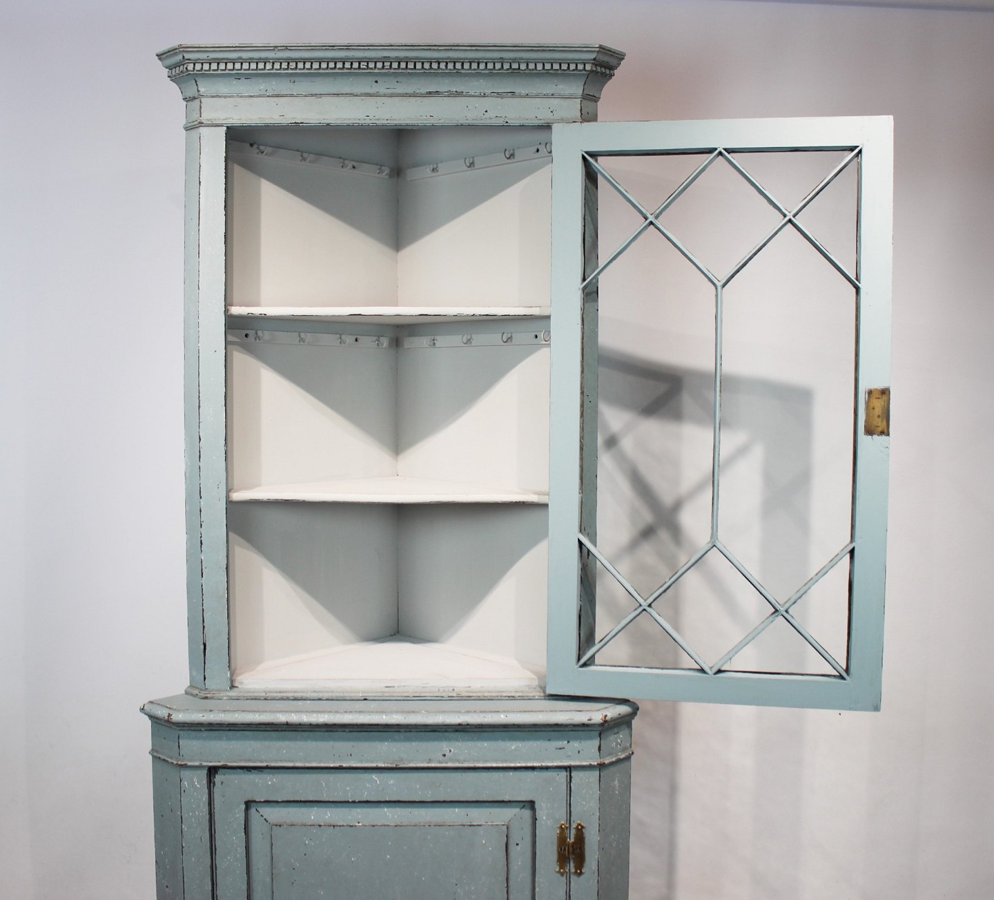 SolgtStort blå malet gustaviansk hjørneskab fra 1880erne, i flot antik stand.