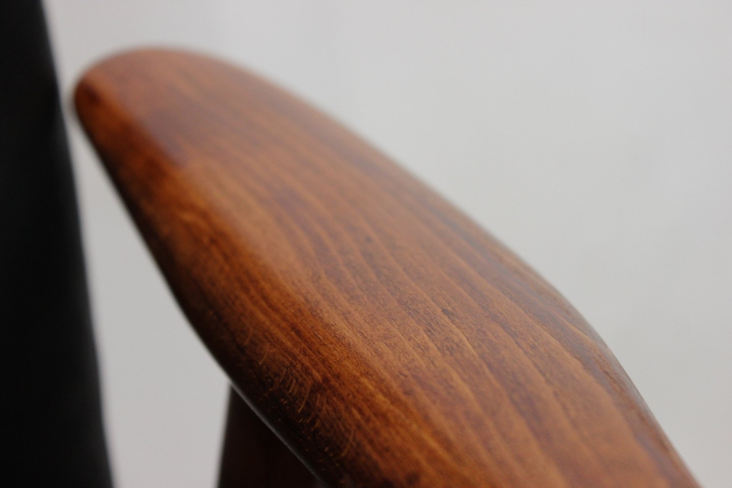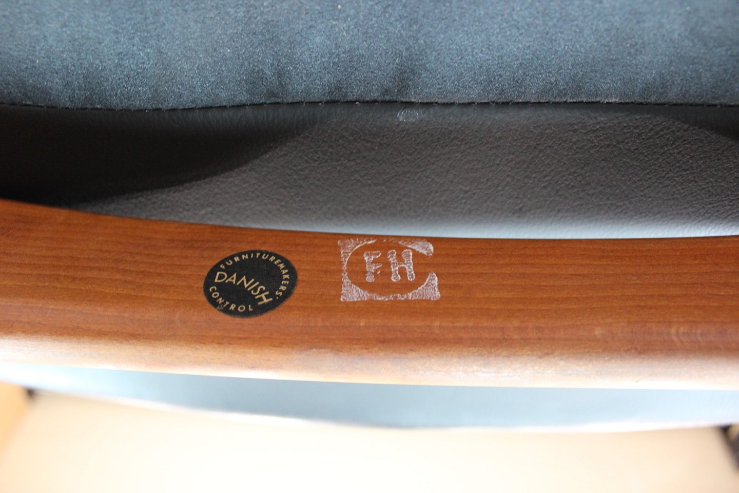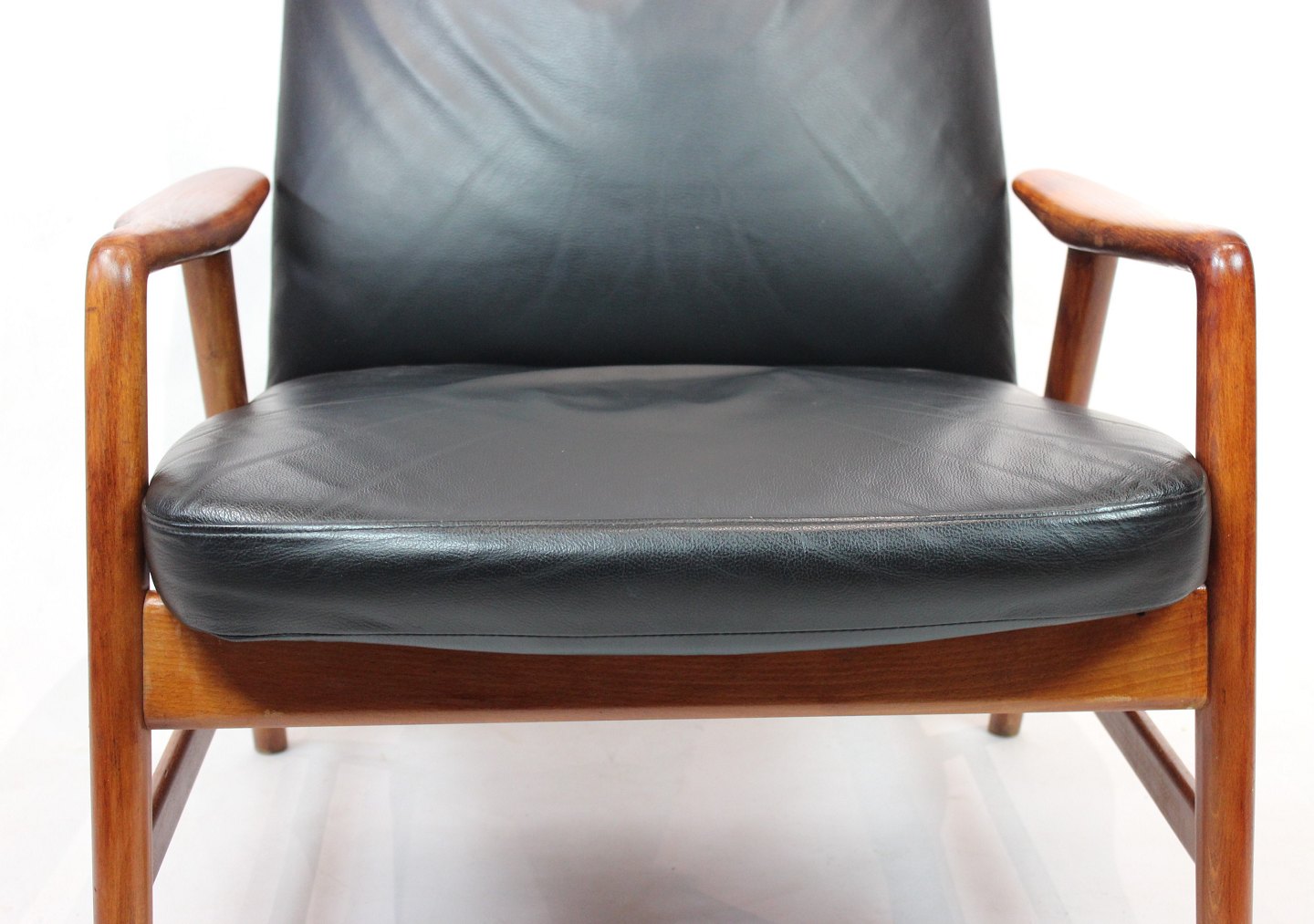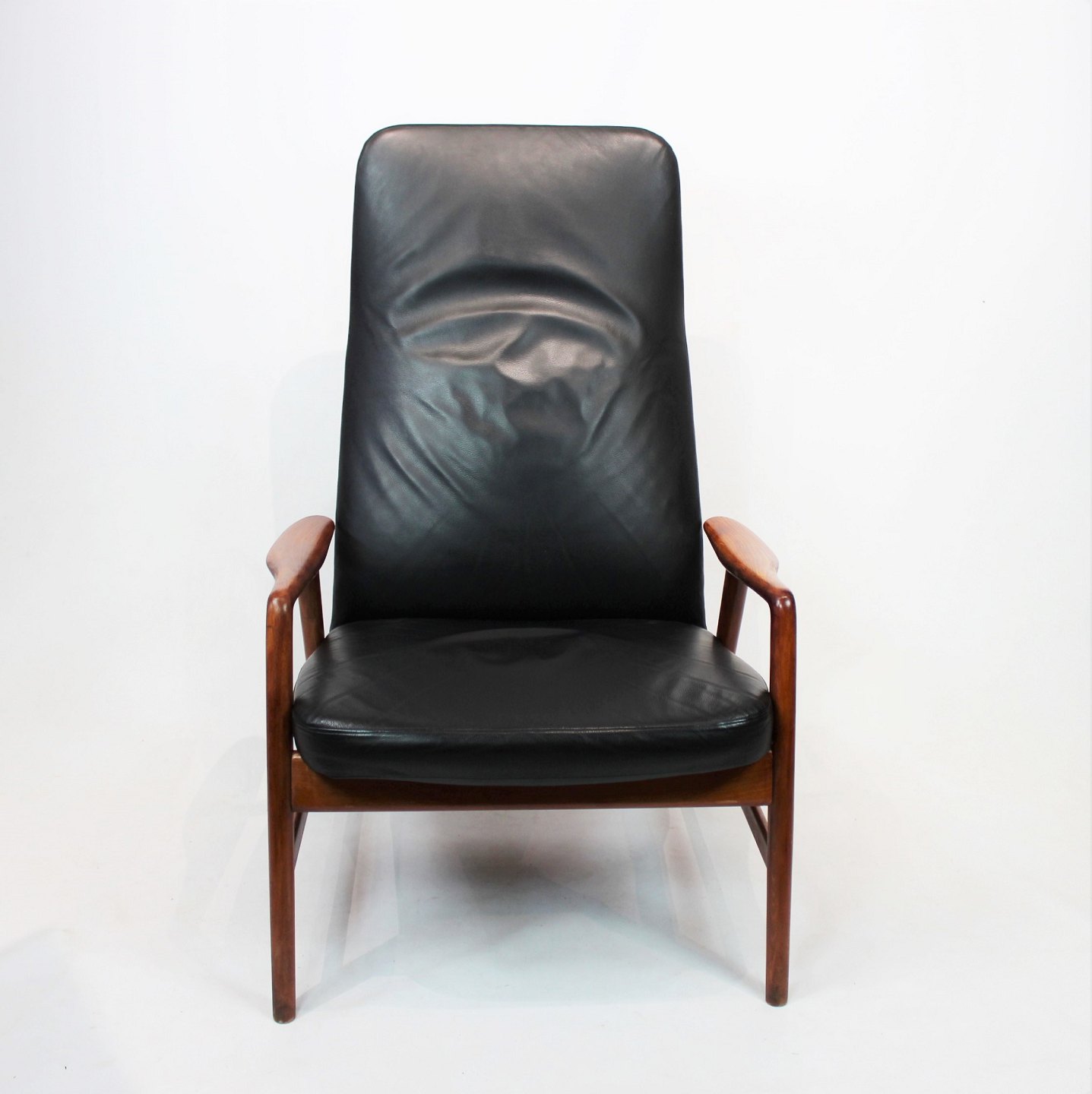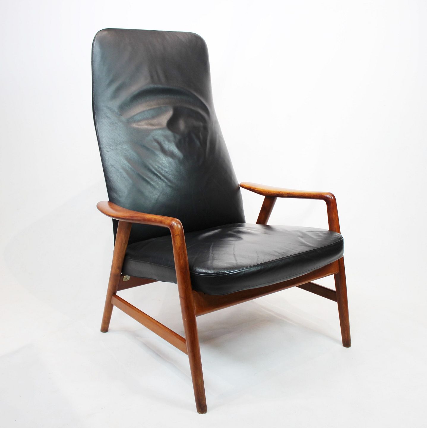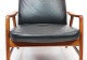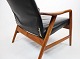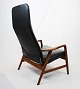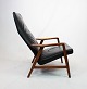 SolgtHvilestol af poleret træ og sort læder designet af Alf Svensson og fremstillet af Fritz Hansen i 1960erne. Stolen er i flot brugt stand og ryggen kan indstilles.