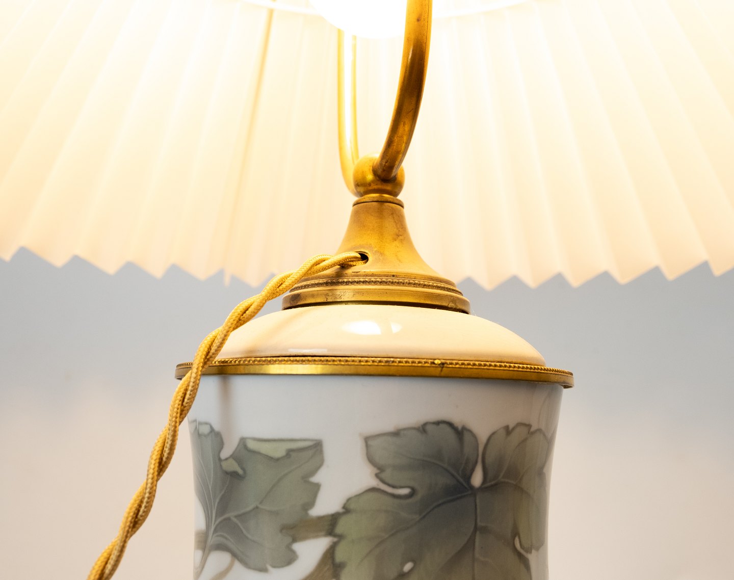 Porcelænsbordlampe af Royal Copenhagen med dekorationsnummer 583/67. Skærmen er håndmalet og håndfoldet i papir.