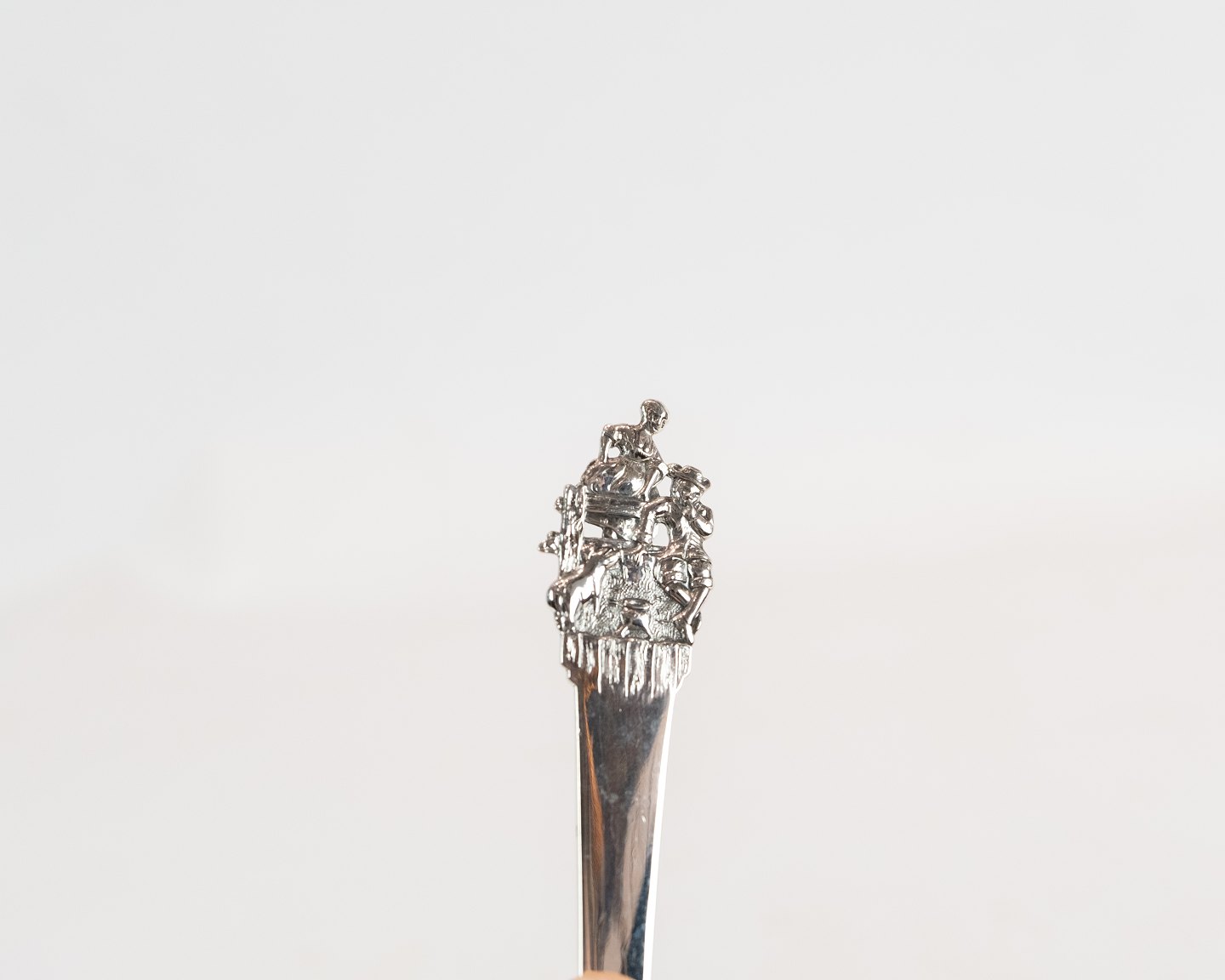 Pusher for food with the motif of H.C. Andersen's Clumsy Hans in hallmarked silver.