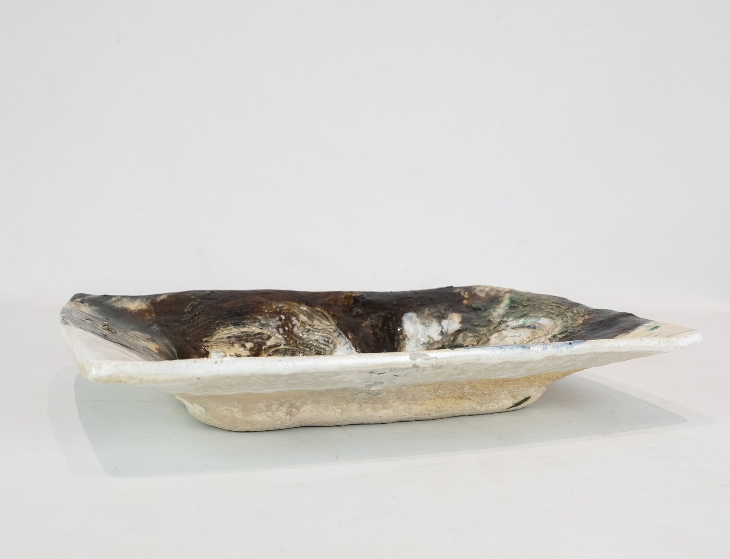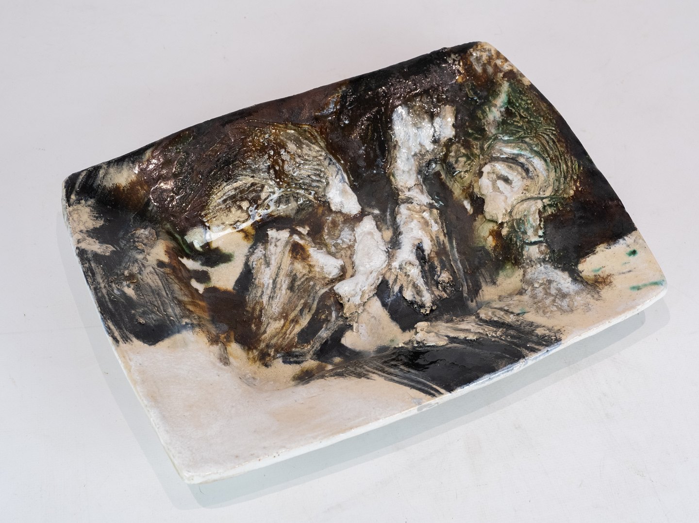 Ceramic dish in dark and light colors by Jeppe Hagedorn Olsen.
