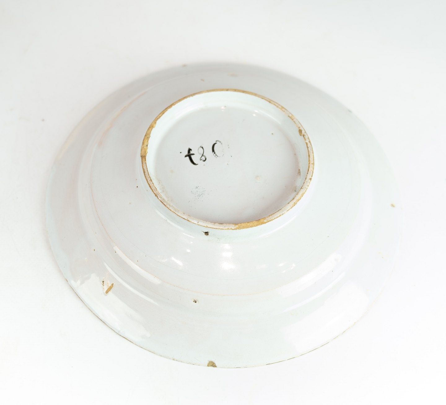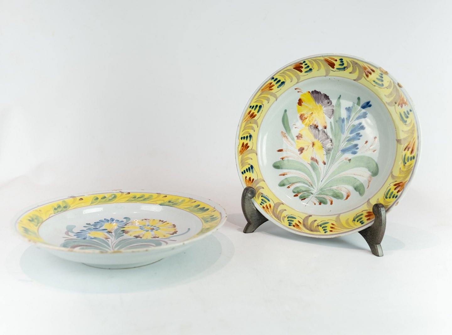To Kelling Husen tallerkner dekoreret i gule farver med forskellige motiver af tysk fajance fra 1780.