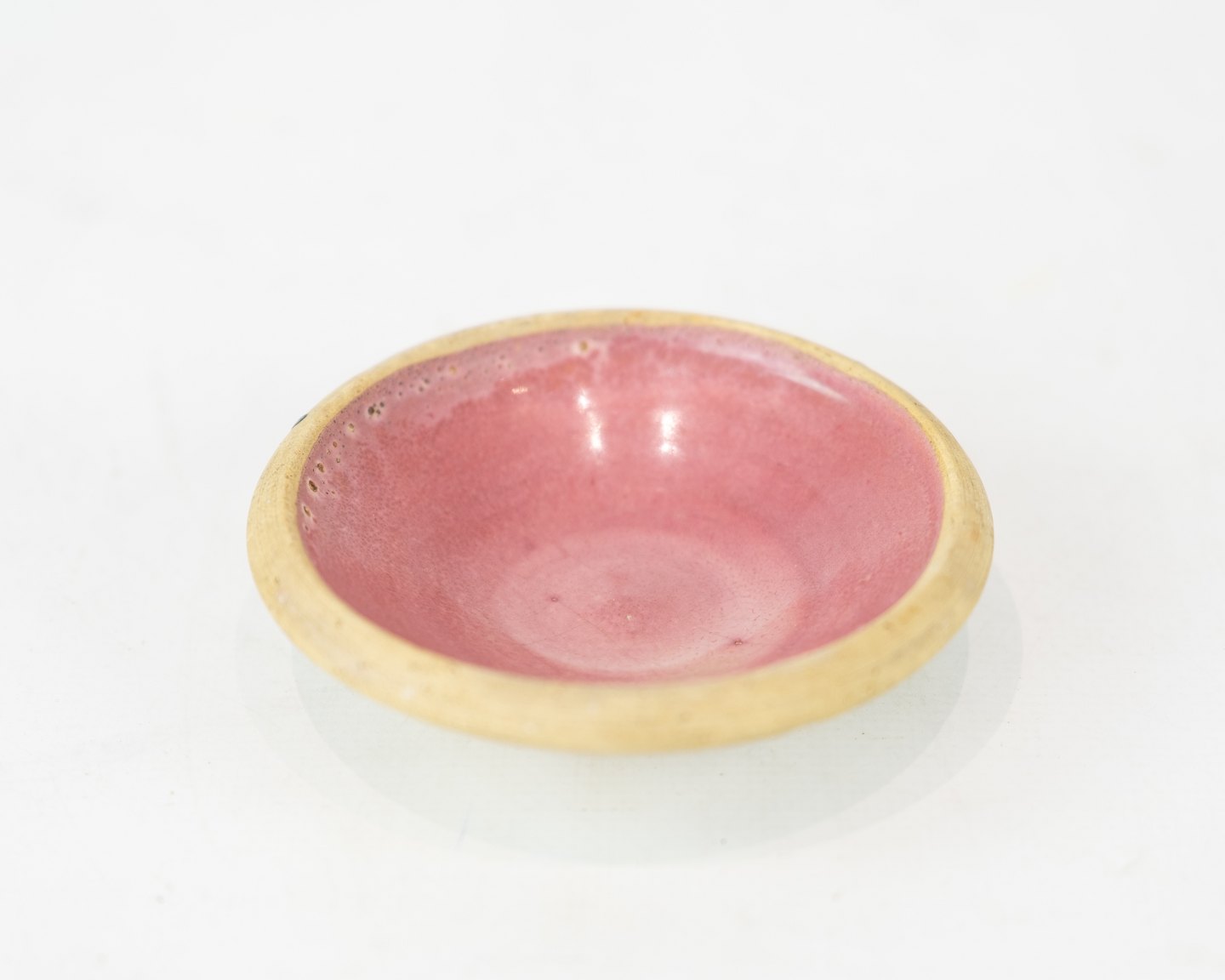 Et sæt keramik saltkar med rød og lyserød glasur.