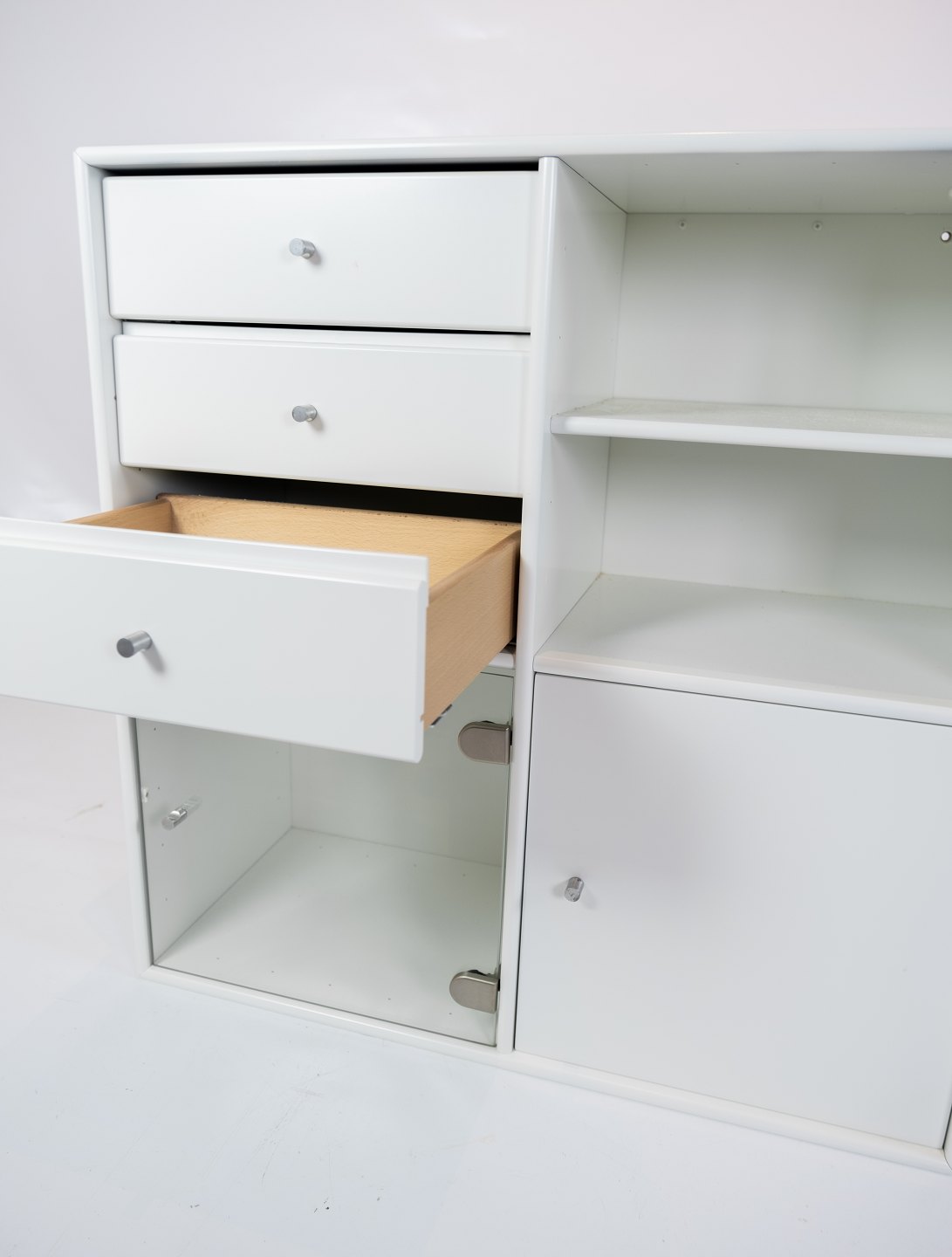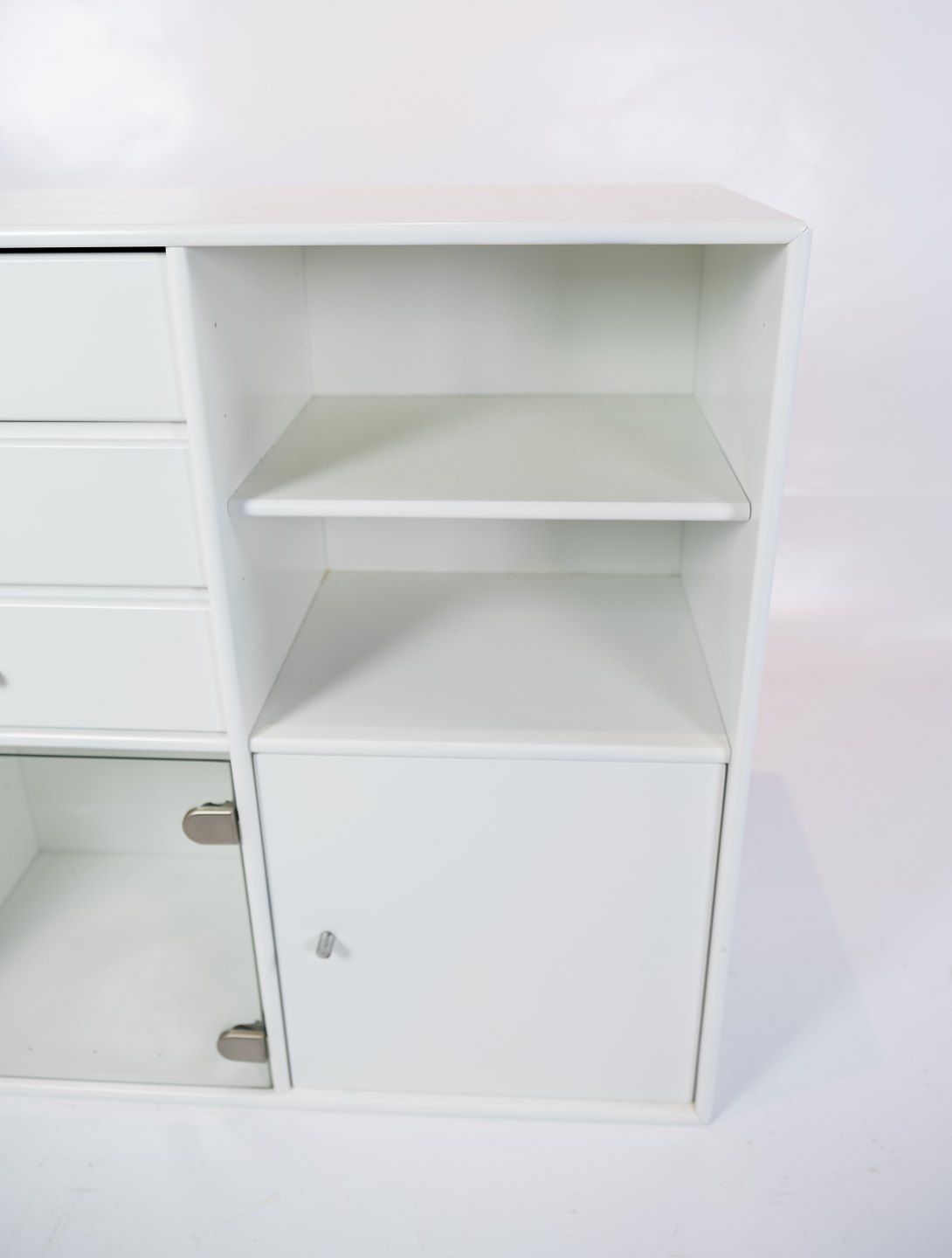 SolgtHvidt Montana modul med 3 skuffer, 2 hylder og 2 rum med henholdsvis glas og almindelig låge, designet af Peter J. Lassen.
