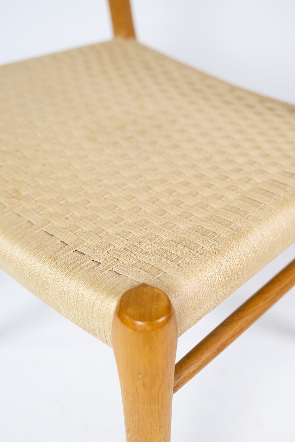 Fremstillet af eg og papirflet, er disse stole i flot brugt stand, hvilket vidner om deres holdbarhed og skønhed med årene. Med deres smukke træ og det delikate papirflet vil disse stole være et elegant og stilfuldt tilføjelse til enhver spisestue, der værdsætter dansk designarv.