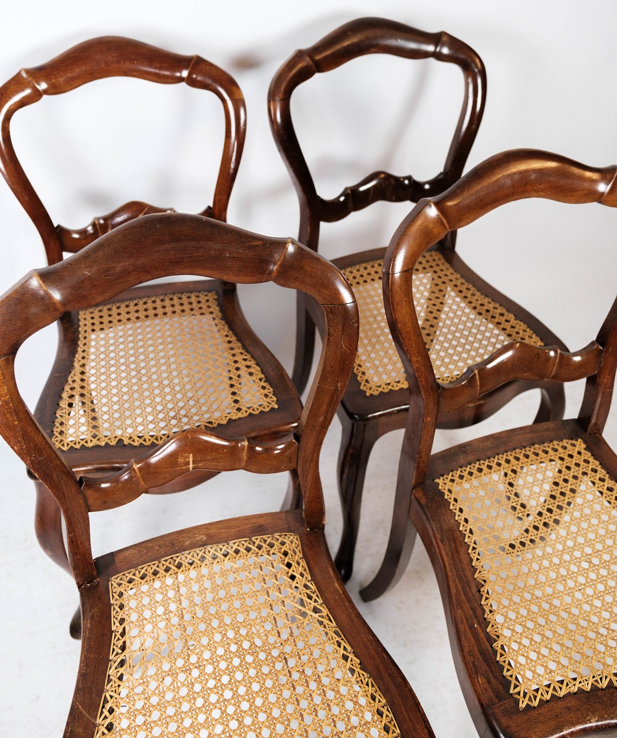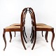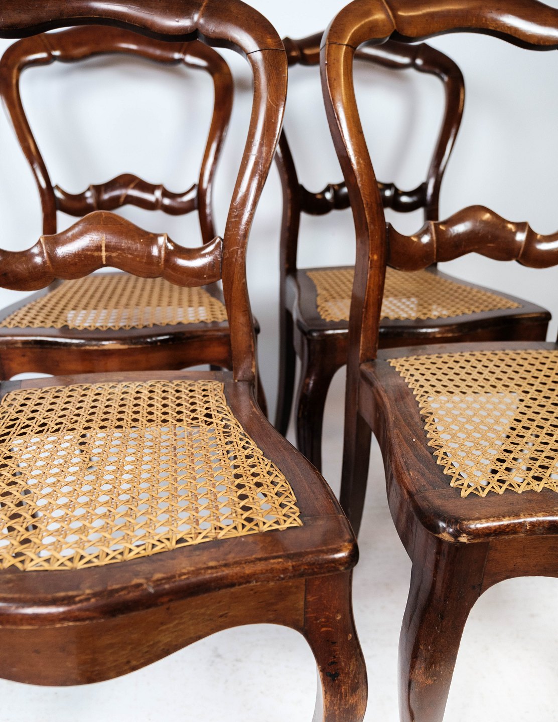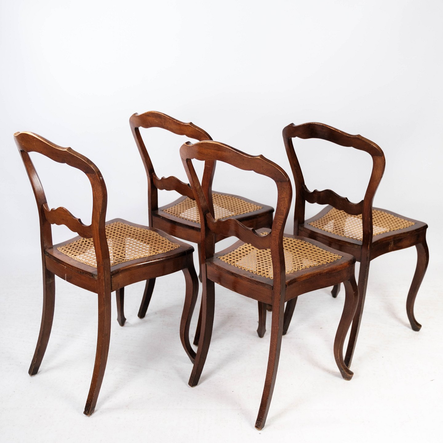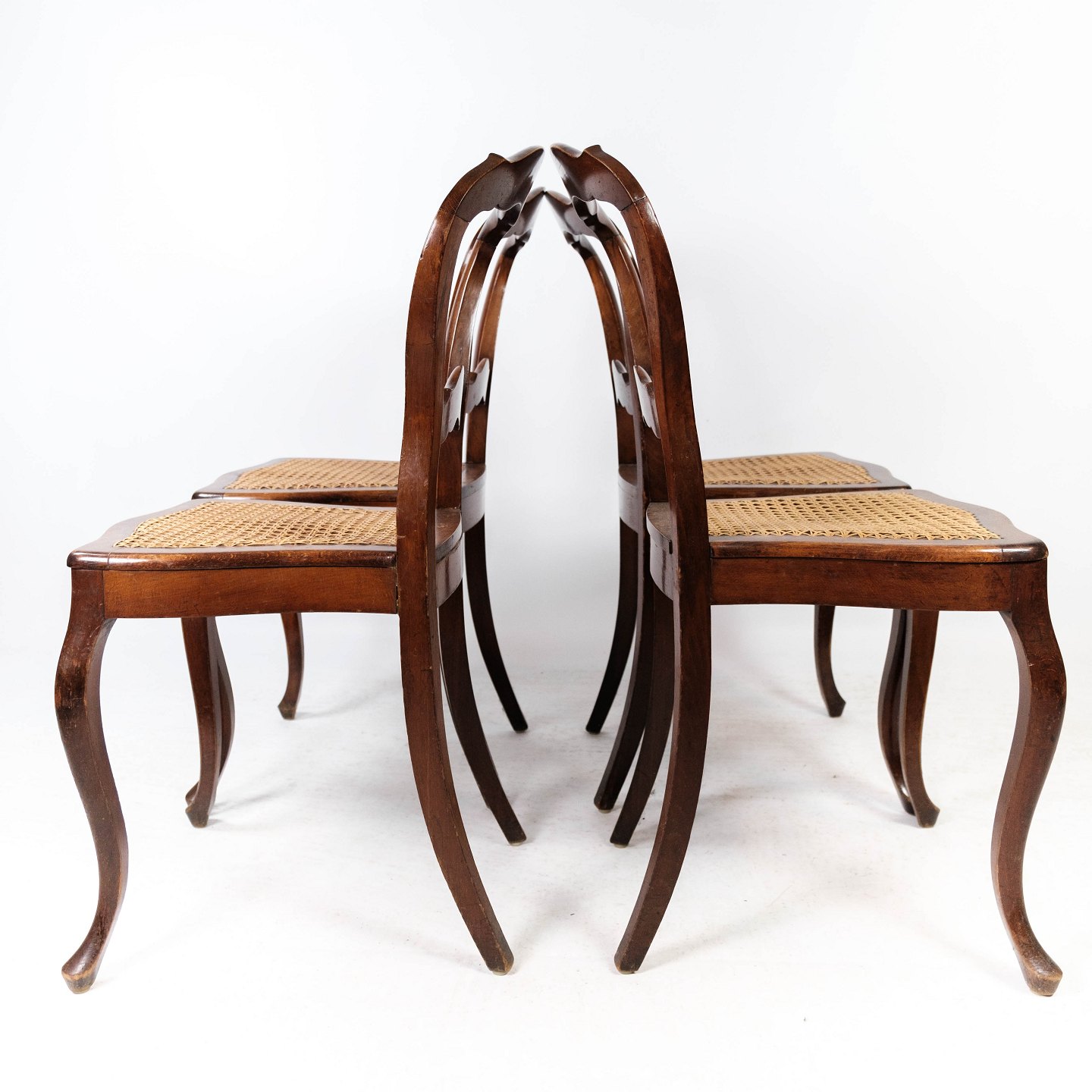 SolgtSæt af fire rokoko spisestuestole af mahogni og med sæde af fransk rørflet fra 1860. Stolene er i flot antik stand.