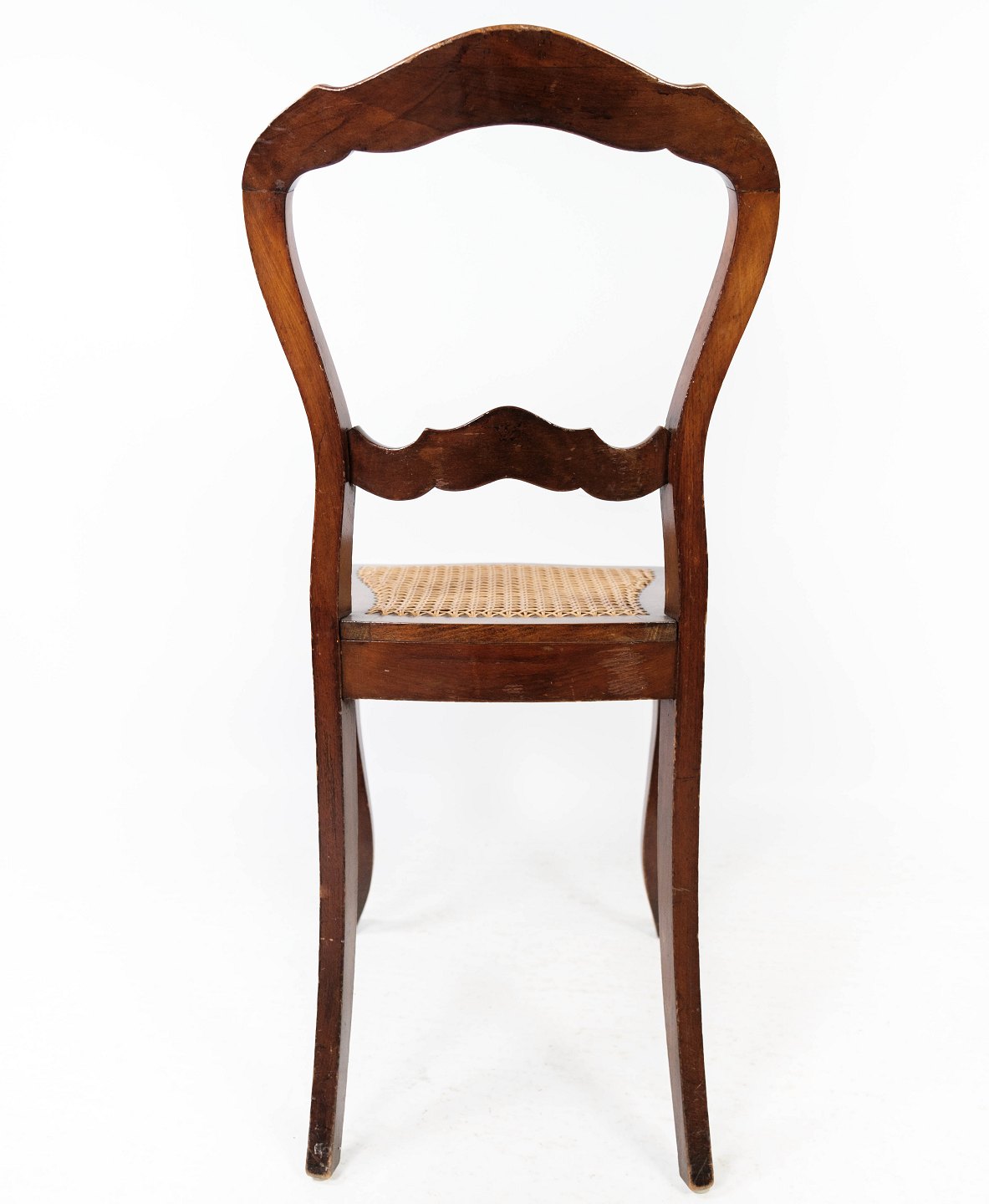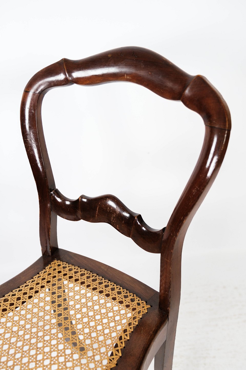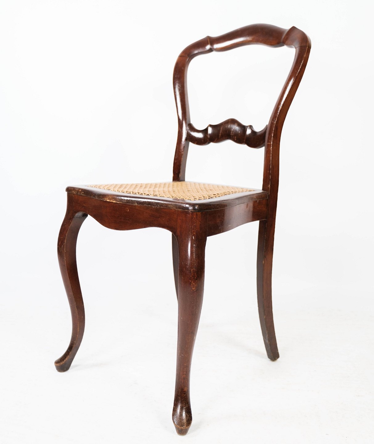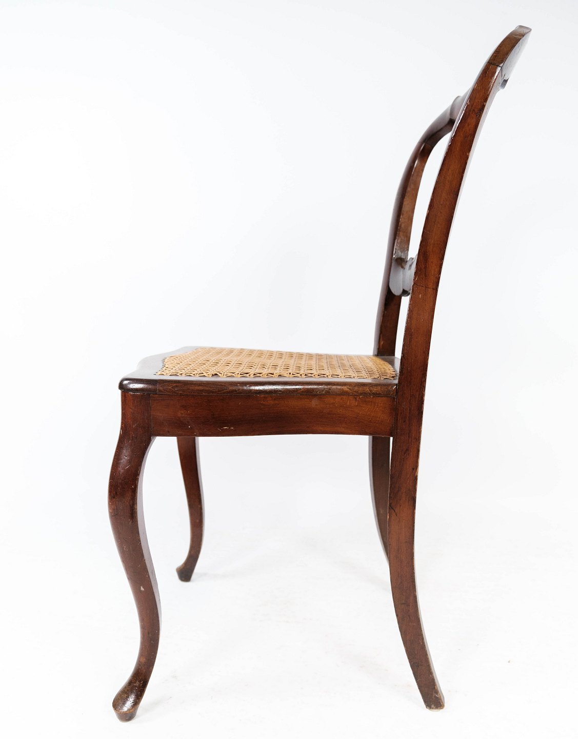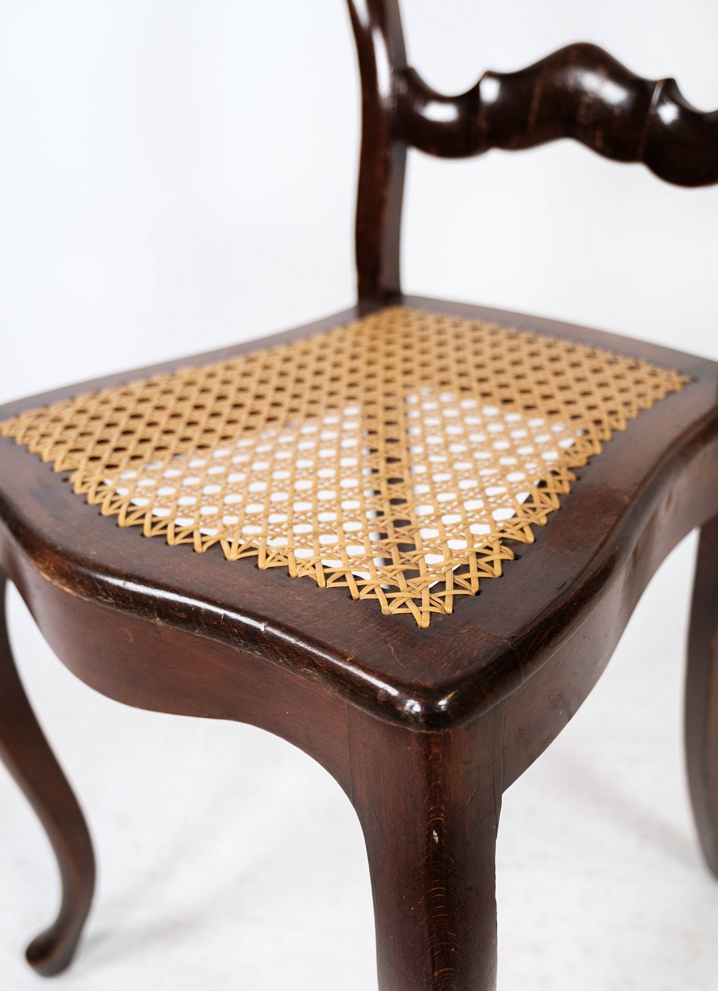 SolgtSæt af fire rokoko spisestuestole af mahogni og med sæde af fransk rørflet fra 1860. Stolene er i flot antik stand.