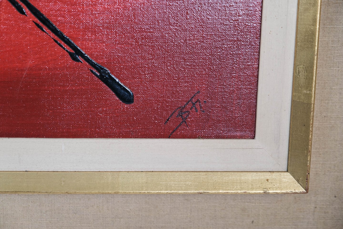 Painting on canvas in dark colors and gilded frame, signed B.F.