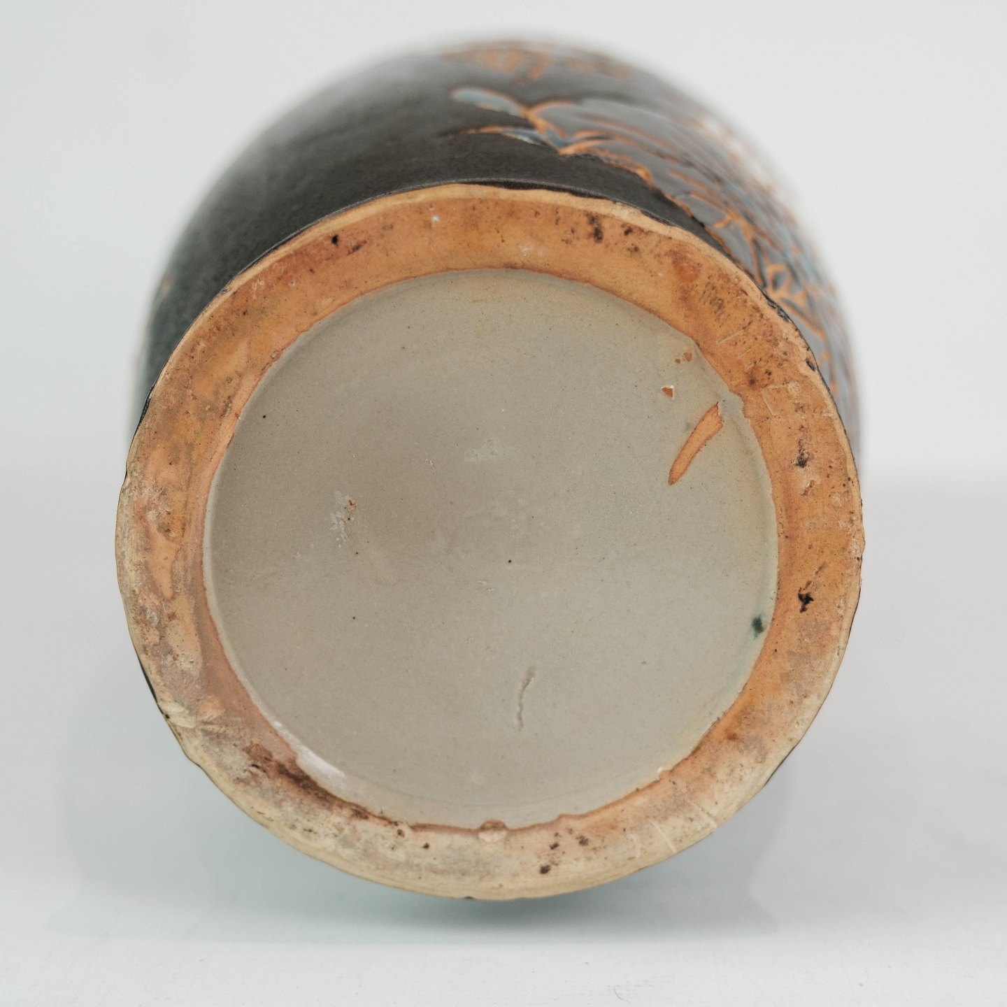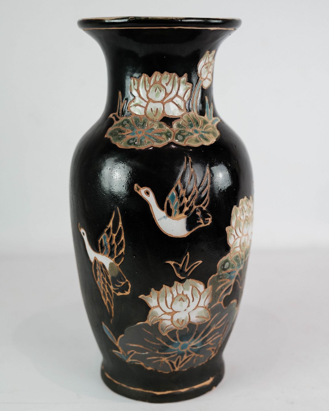 Ceramic vase with black glaze and decorated with flowers. The vase is in great vintage condition.
