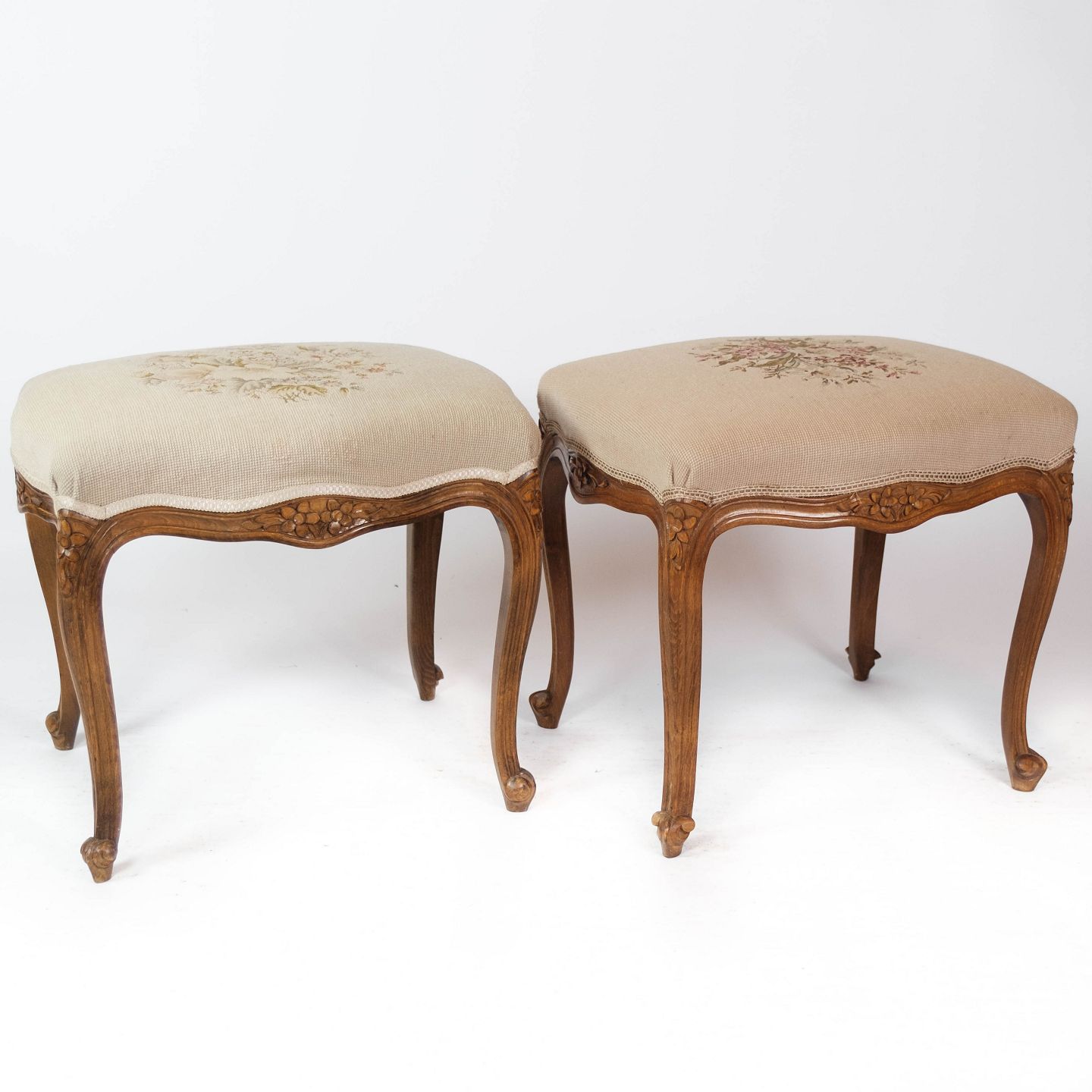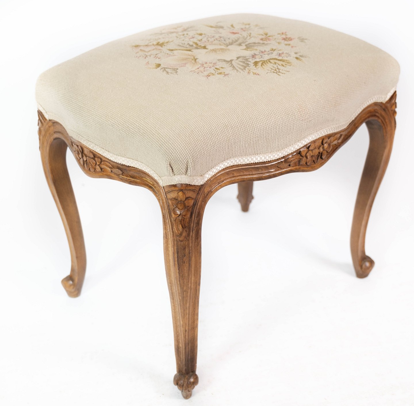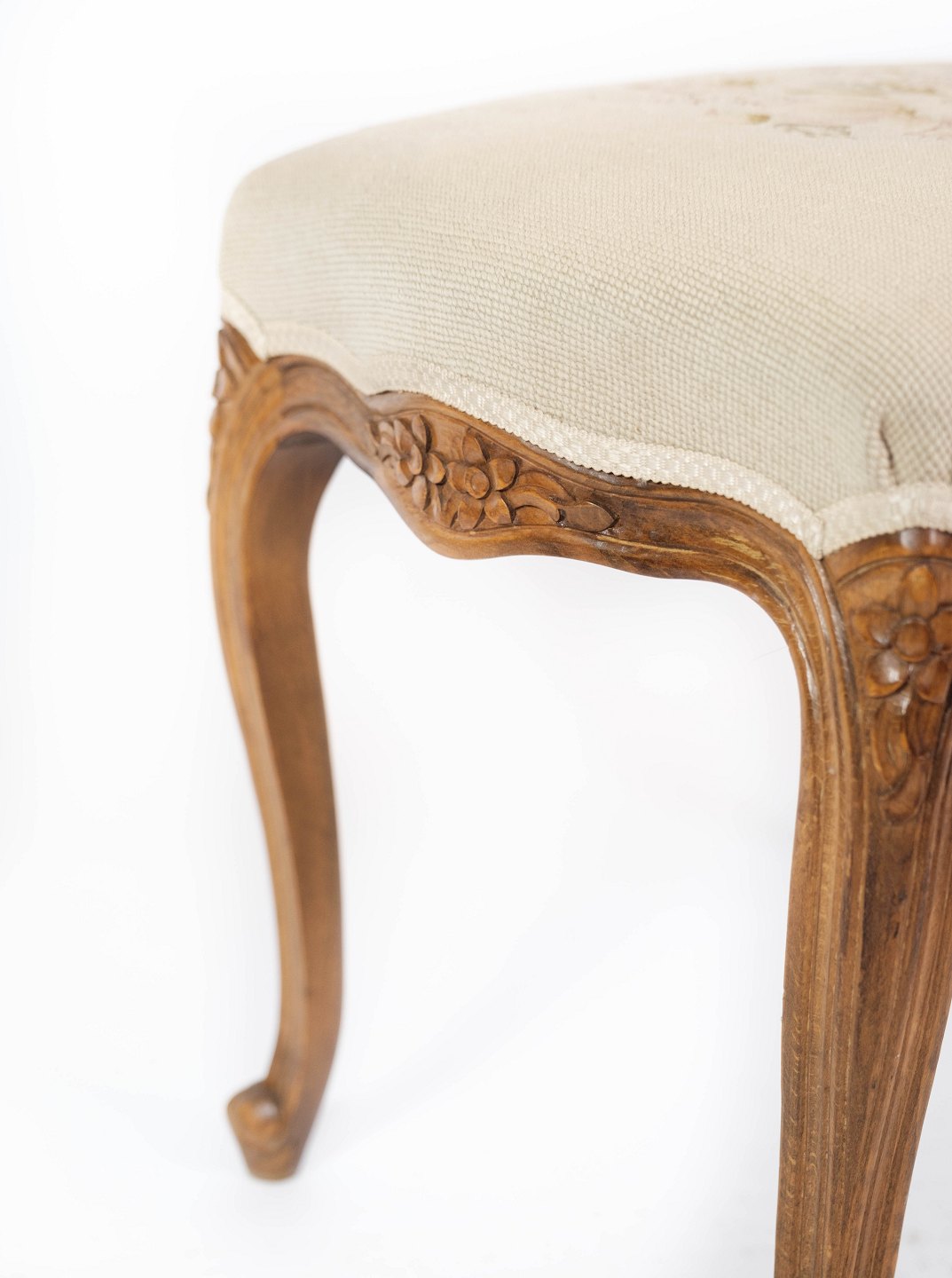 SolgtEt sæt skamler af lyst træ og polstret med lyst stof, i flot antik stand fra 1930erne.