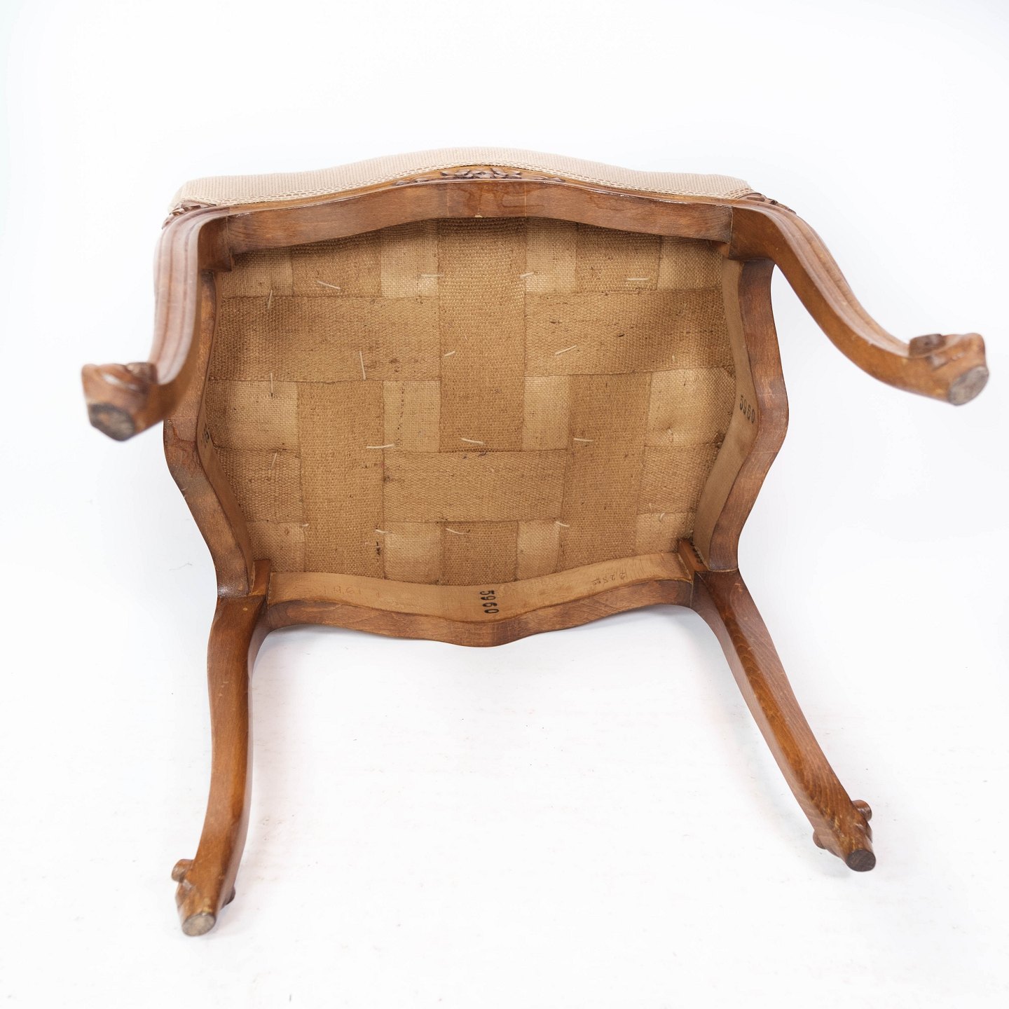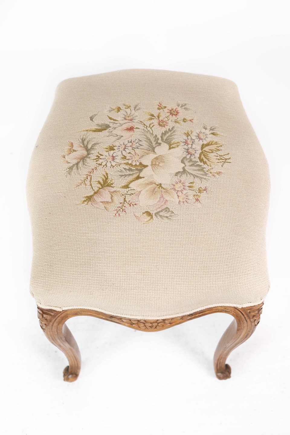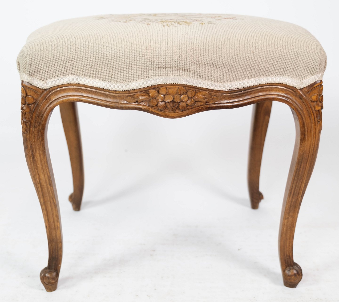 SolgtEt sæt skamler af lyst træ og polstret med lyst stof, i flot antik stand fra 1930erne.