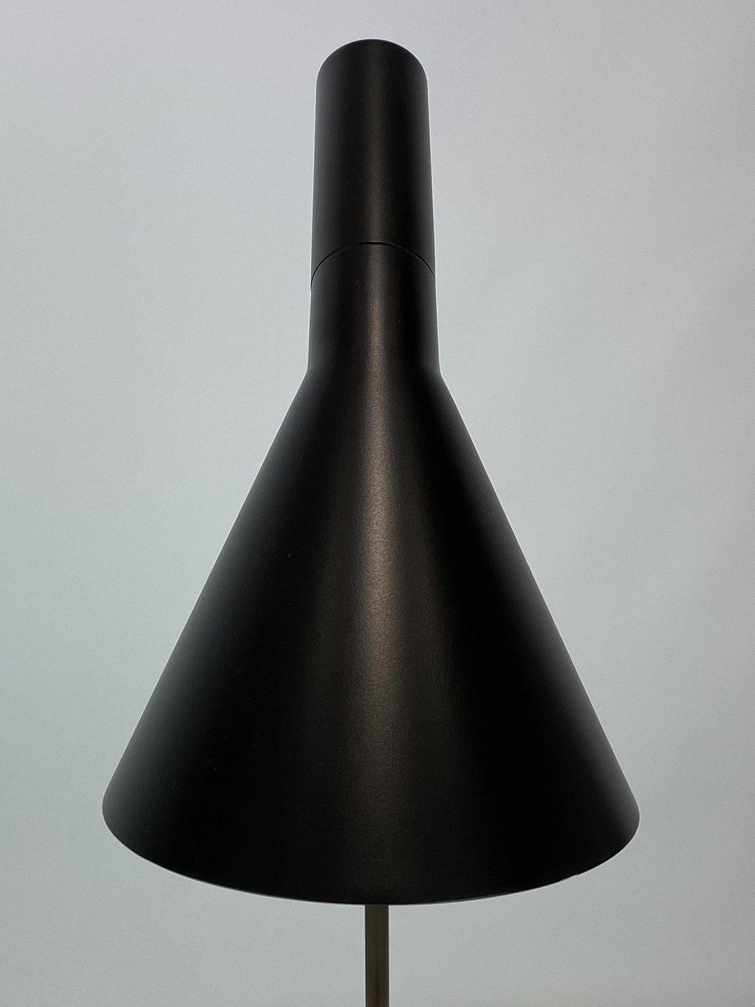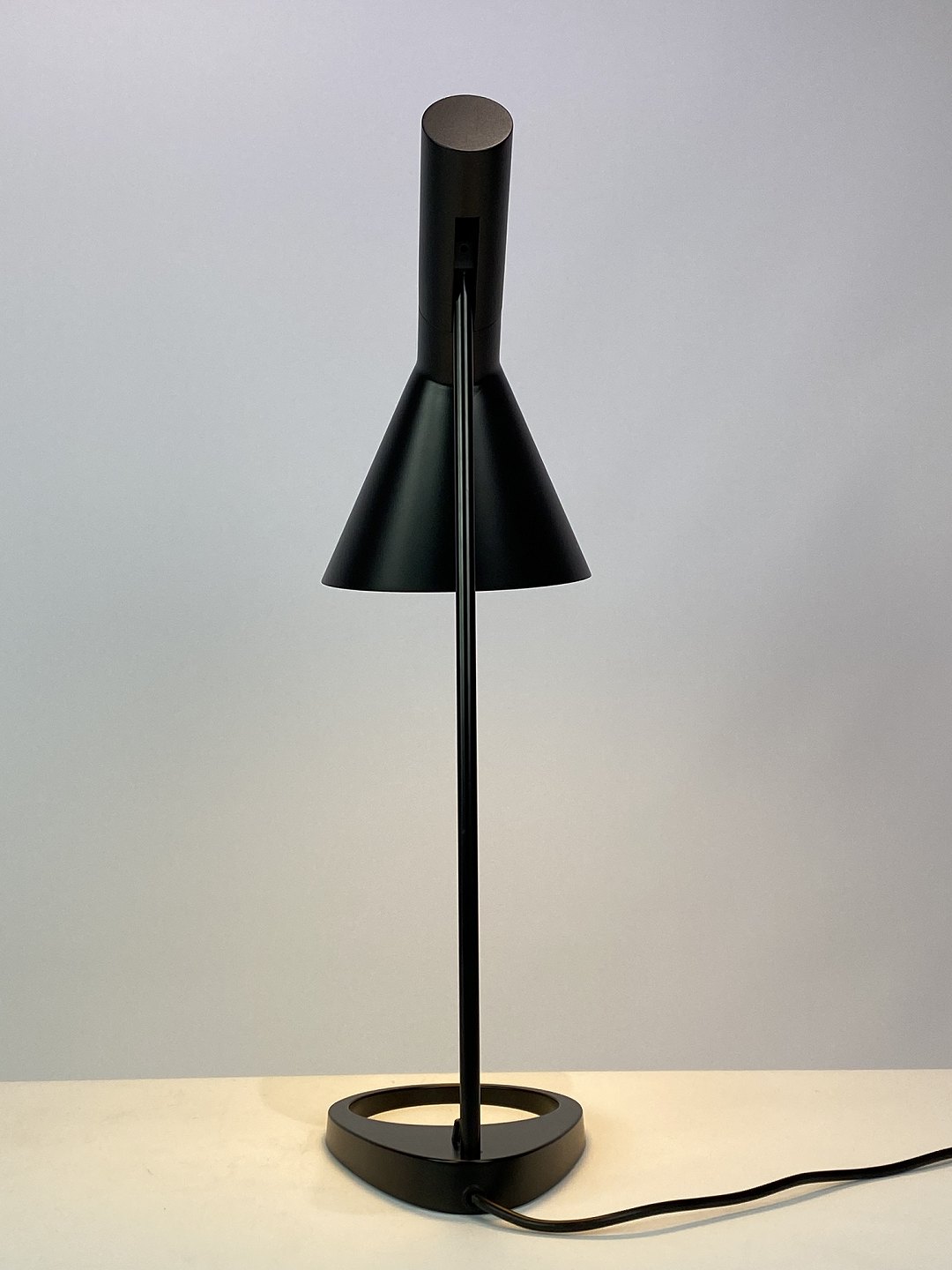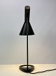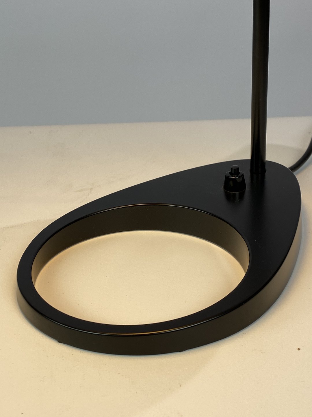SoldBlack table lamp designed by Arne Jacobsen and manufactured by Louis Poulsen. The lamp was originally designed for the SAS Royal Hotel in Copenhagen in 1957 for the hotel's design concept. The lamp here is the original made of steel with a tiltable head, which emits a direct and directional light. It is lacquered white on the inside and black on the outside. The lamp is in great vintage condition.