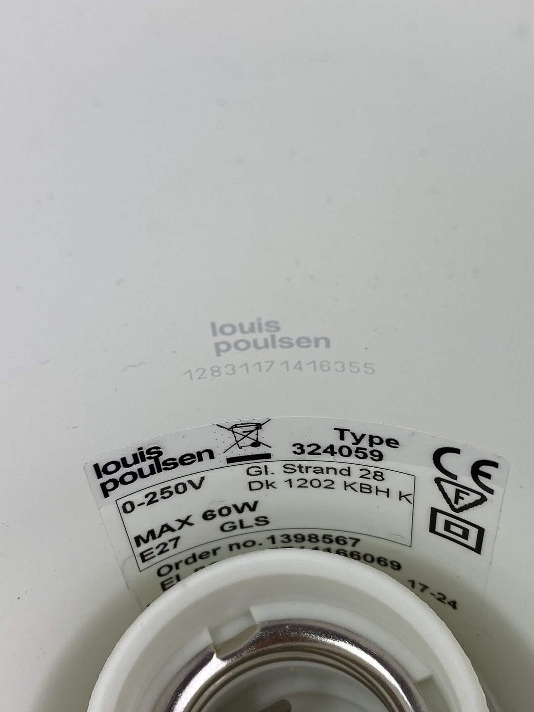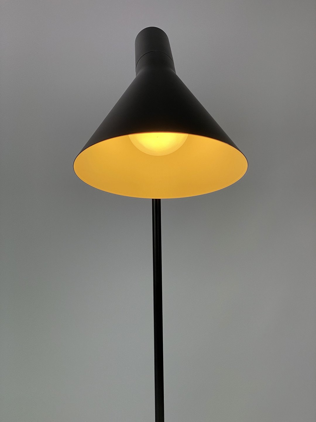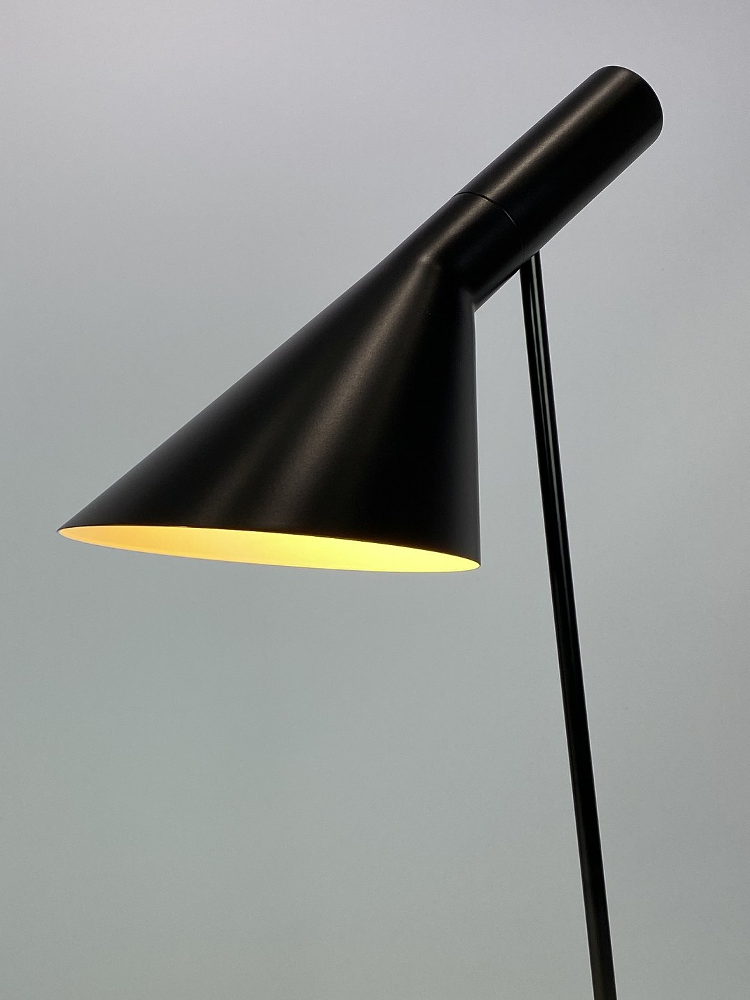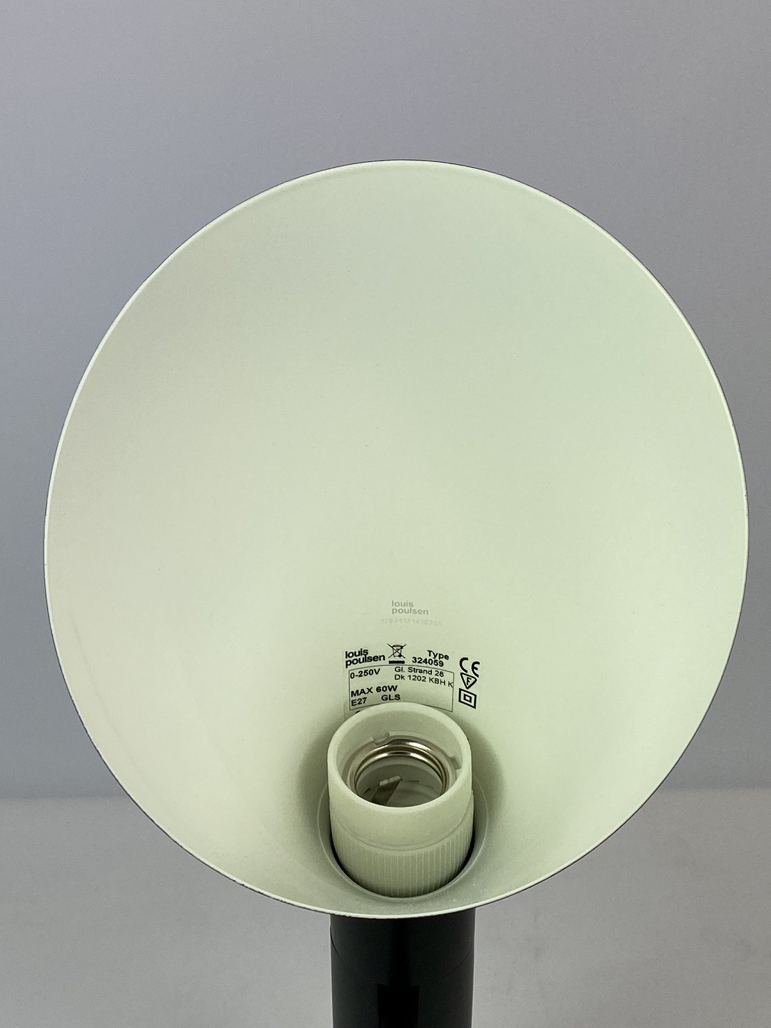 SoldBlack table lamp designed by Arne Jacobsen and manufactured by Louis Poulsen. The lamp was originally designed for the SAS Royal Hotel in Copenhagen in 1957 for the hotel's design concept. The lamp here is the original made of steel with a tiltable head, which emits a direct and directional light. It is lacquered white on the inside and black on the outside. The lamp is in great vintage condition.
